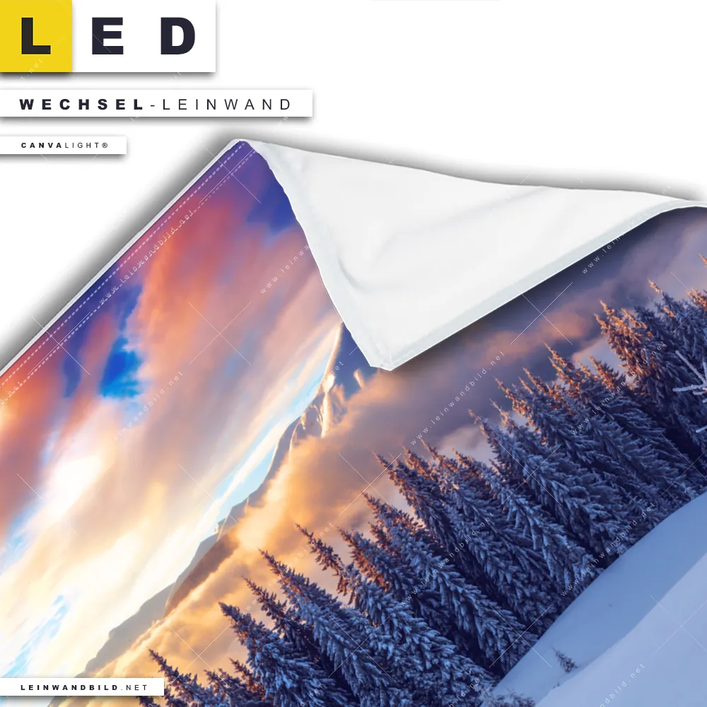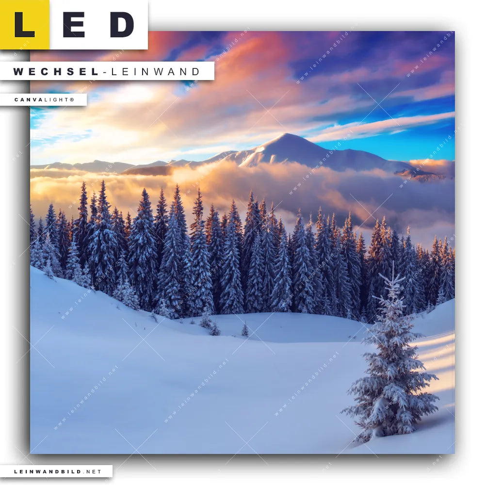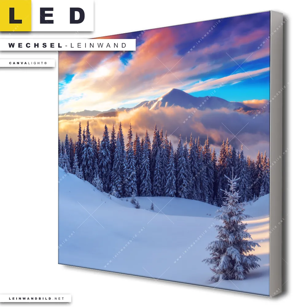 Du bist auf der Suche nach einer Landschaften, Winter Wechsel-Leinwand für Dein LED-Leinwandbild im Quadratischen Format? Begriffe wie Berge, Gebirge, Schneelandschaft, Winter, Schnee, Sonnenaufgang, Weihnachten, Nadelwald haben Dich auf der Suche nach Deiner Ersatz-Leinwand für dein LED Wandbild mit wechselbarer Leinwand inspiriert? Farben wie Blau, Weiss, Orange dürfen auf Deinem neuen Wechselmotiv für Dein XXL Leinwand-LED-Bild nicht fehlen und Leinwände im Natürlich - Realistisch Stil für Leuchtbilder passen perfekt zu Deinem Einrichtungsstil?