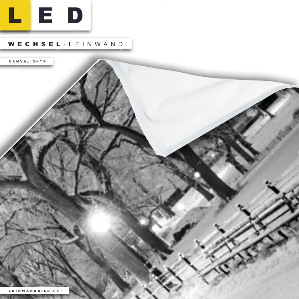 Bitte beachte, dass die Farben, der auf dem Monitor abgebildeten Schnee, Bänke und Laternen Darstellung, möglicherweise von den Originalfarben deiner Canvalight® TEX Wechsel-Leinwand abweichen können.