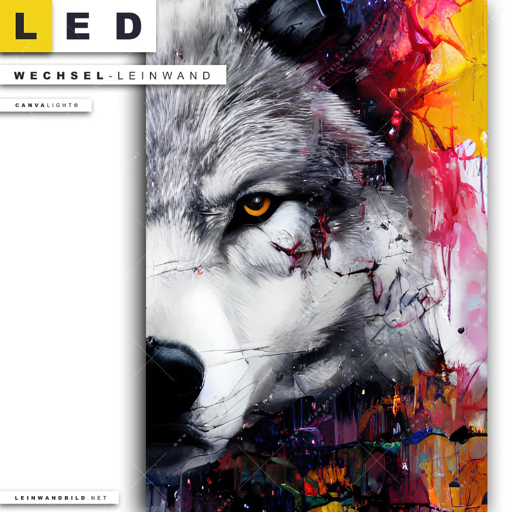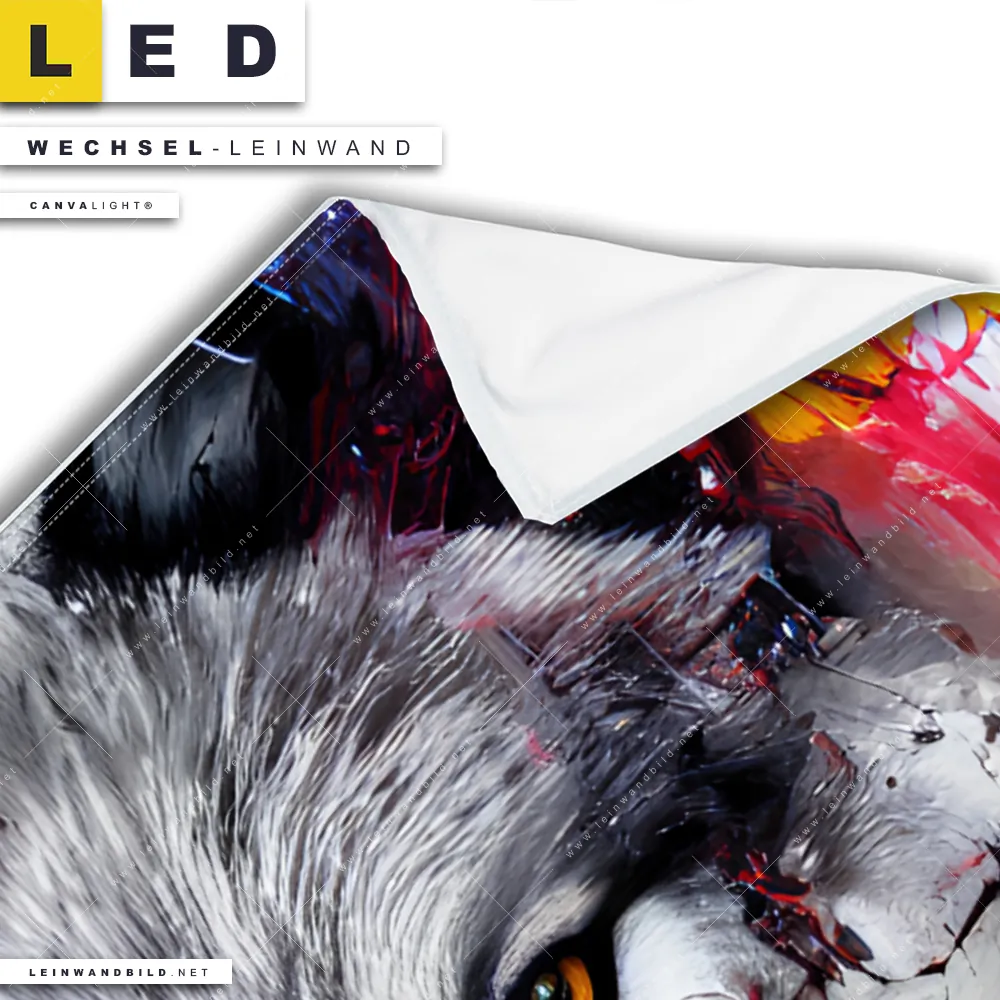 LED Wechsel-Leinwand Canvalight® TEX | Wolf mit bunten Farbspritzern | Hochformat