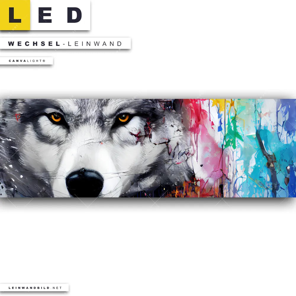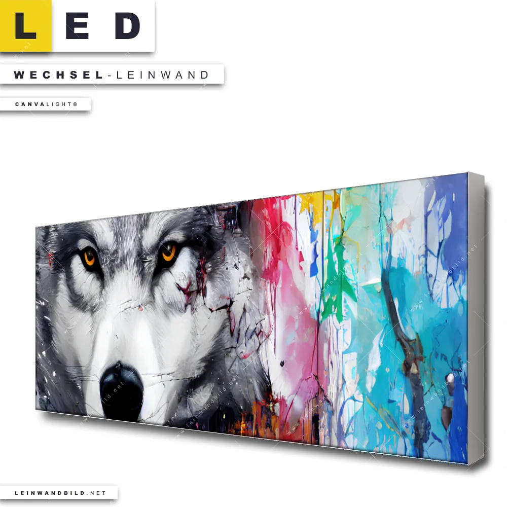 LED Wechsel-Leinwand Canvalight® TEX | Wolf mit bunten Farbspritzern | Panorama