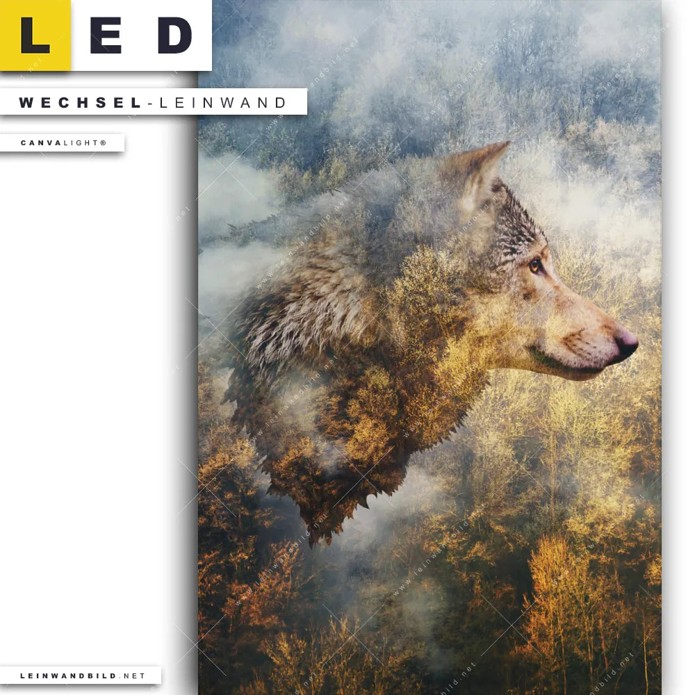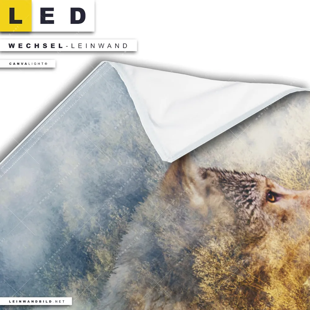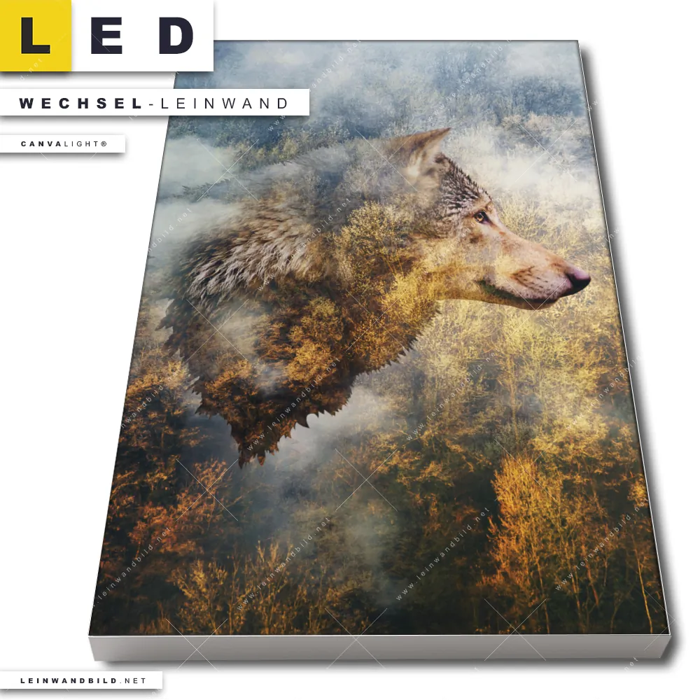 Du bist auf der Suche nach einer Tierwelt Wechsel-Leinwand für Dein LED-Leinwandbild im Hochformat? Begriffe wie Wolf, Wald, Doppelbelichtung, Natur, skandinavisch, Bäume haben Dich auf der Suche nach Deiner Ersatz-Leinwand für dein LED Wandbild mit wechselbarer Leinwand inspiriert? Farben wie Beige, Braun, Blau, Orange dürfen auf Deinem neuen Wechselmotiv für Dein XXL Leinwand-LED-Bild nicht fehlen und Leinwände im Modern Art Stil für Leuchtbilder passen perfekt zu Deinem Einrichtungsstil?