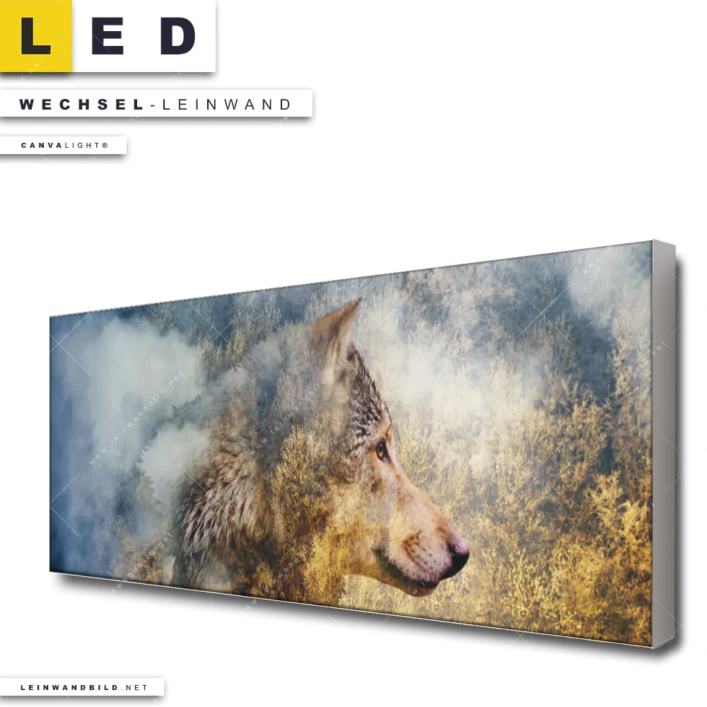 Du bist auf der Suche nach einer Tierwelt Wechsel-Leinwand für Dein LED-Leinwandbild im Panorama-Format? Begriffe wie Wolf, Wald, Doppelbelichtung, Natur, skandinavisch, Bäume haben Dich auf der Suche nach Deiner Ersatz-Leinwand für dein extra breites LED Wandbild mit wechselbarer Leinwand inspiriert? Farben wie Beige, Braun, Blau, Orange dürfen auf Deinem neuen Wechselmotiv für Dein XXL Leinwand-LED-Bild nicht fehlen und Leinwände im Modern Art Stil für Leuchtbilder passen perfekt zu Deinem Einrichtungsstil?