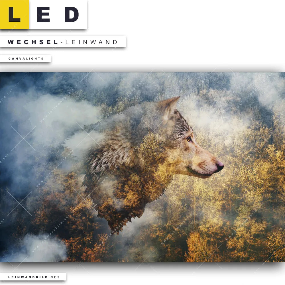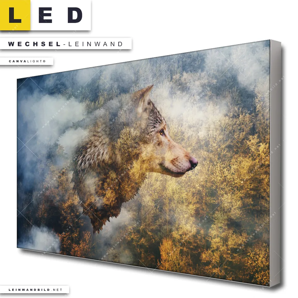 Du bist auf der Suche nach einer Tierwelt Wechsel-Leinwand für Dein LED-Leinwandbild im Querformat? Begriffe wie Wolf, Wald, Doppelbelichtung, Natur, skandinavisch, Bäume haben Dich auf der Suche nach Deiner Ersatz-Leinwand für dein breites LED Wandbild mit wechselbarer Leinwand inspiriert? Farben wie Beige, Braun, Blau, Orange dürfen auf Deinem neuen Wechselmotiv für Dein XXL Leinwand-LED-Bild nicht fehlen und Leinwände im Modern Art Stil für Leuchtbilder passen perfekt zu Deinem Einrichtungsstil?