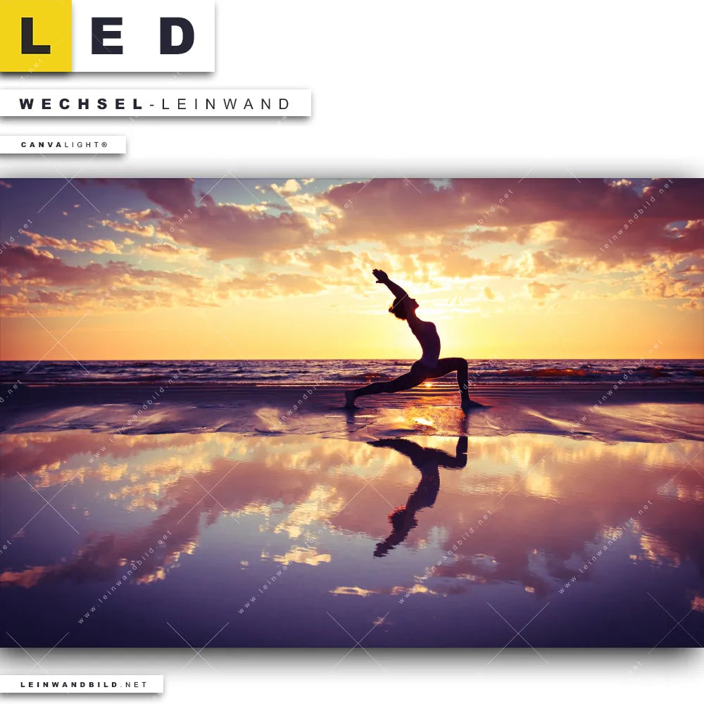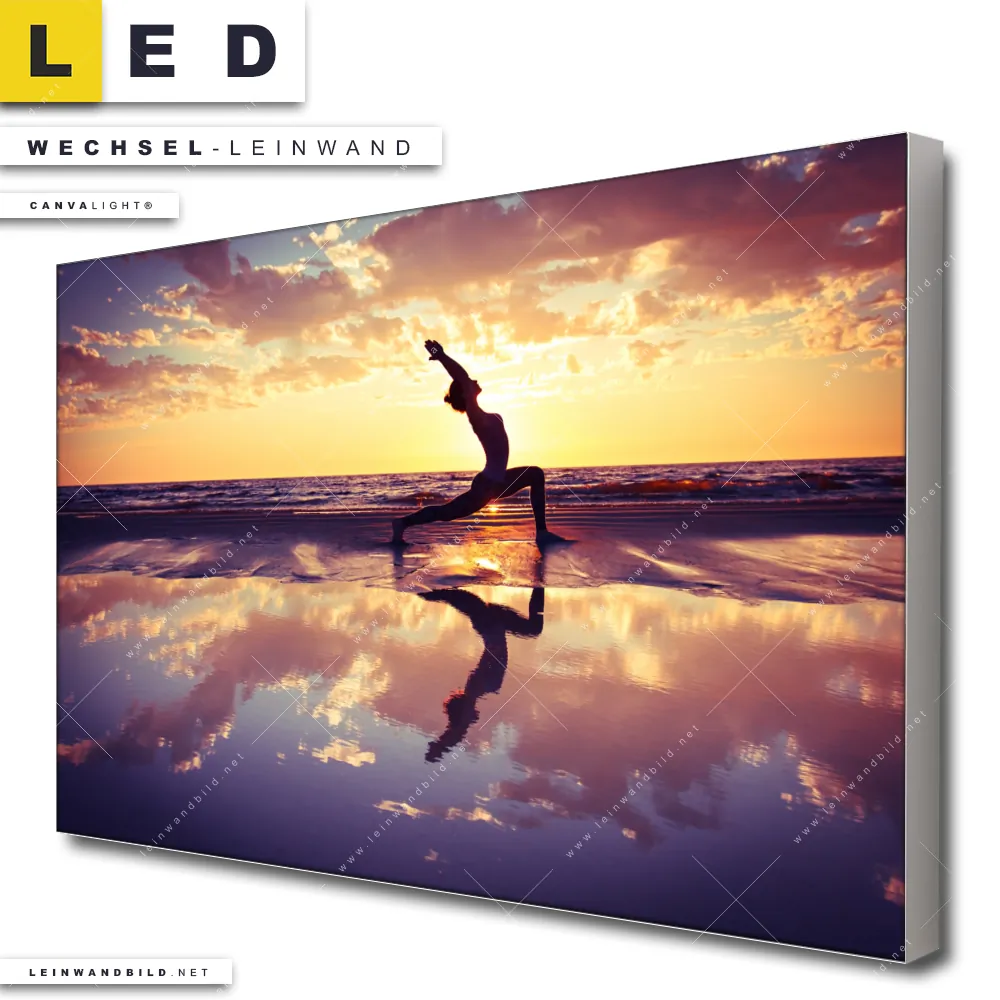LED Wechsel-Leinwand Canvalight® TEX | Yoga am lila Strand | Querformat