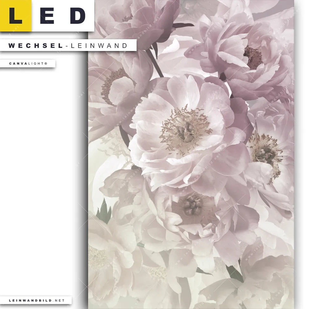 Du bist auf der Suche nach einer Blumen - Botanik Wechsel-Leinwand für Dein LED-Leinwandbild im Hochformat? Begriffe wie Pflanze, Natur, Blüte, Nahaufnahme, Draufsicht, vintage, Blumen, pastell, Pfingstrosen, Pastellfarben haben Dich auf der Suche nach Deiner Ersatz-Leinwand für dein LED Wandbild mit wechselbarer Leinwand inspiriert? Farben wie Rosa, Weiss dürfen auf Deinem neuen Wechselmotiv für Dein XXL Leinwand-LED-Bild nicht fehlen und Leinwände im Floral, Natürlich - Realistisch, Retro - Vintage Stil für Leuchtbilder passen perfekt zu Deinem Einrichtungsstil?
