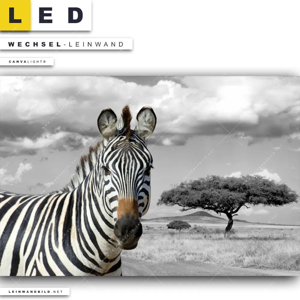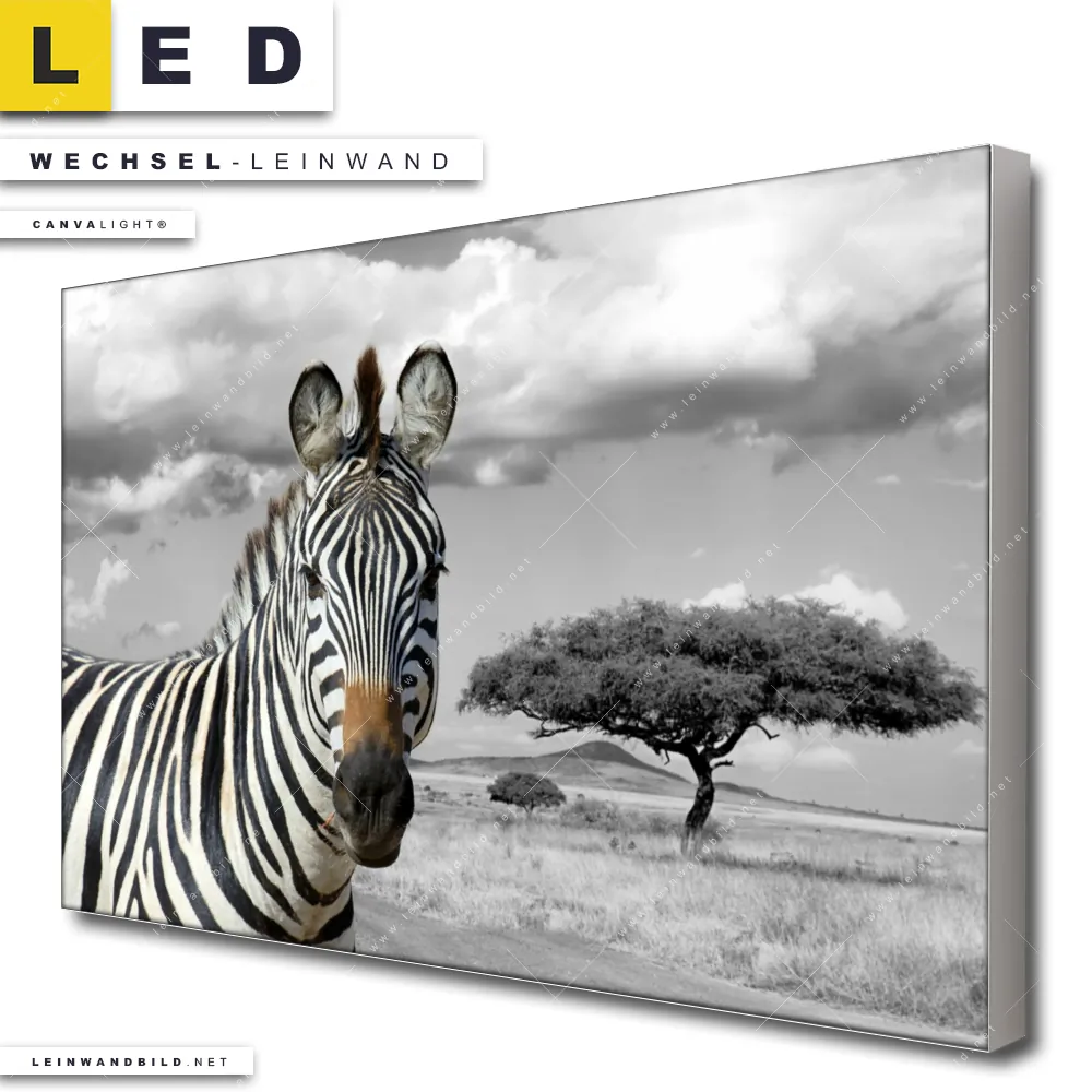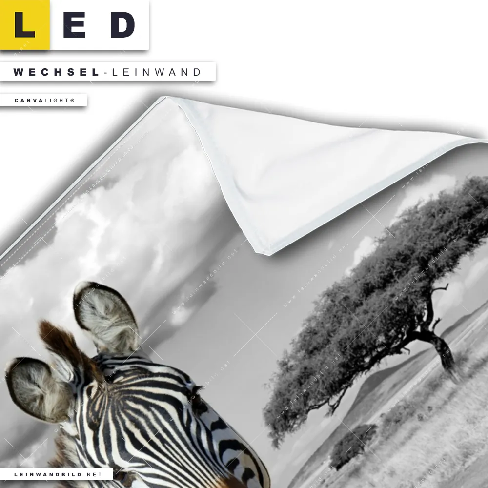 Du konfigurierst Deine individuelle LED Wechsel-Leinwand Canvalight® TEX | Zebra in Afrika | Querformat und wir produzieren sie NEU für Dich. Unsere Landschaften, Tierwelt Austausch-Fotoleinwände für Canvalight® LED Bilder sind KEINE Lagerware. Du bist Dir unsicher, welches Motiv oder Format das richtige für dein individuelles LED Wechselmotiv auf Leinwand ist, dann helfen wir dir gerne weiter und beraten dich!