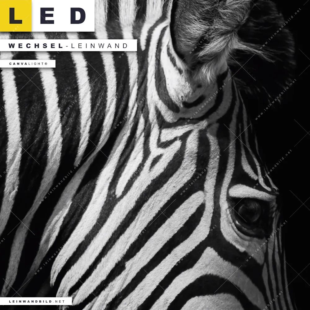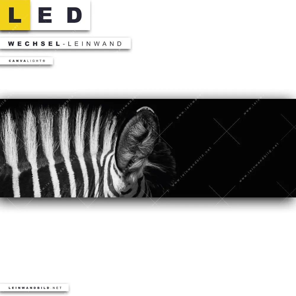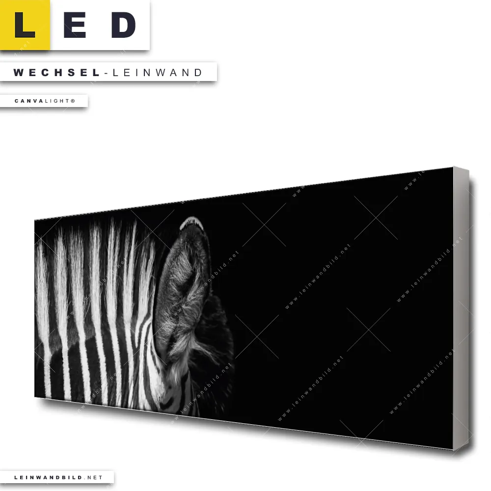 Du konfigurierst Deine individuelle LED Wechsel-Leinwand Canvalight® TEX | Zebra Schwarzweiß | Panorama und wir produzieren sie NEU für Dich. Unsere Tierwelt Austausch-Fotoleinwände für Canvalight® LED Bilder sind KEINE Lagerware. Du bist Dir unsicher, welches Motiv oder Format das richtige für dein individuelles LED Wechselmotiv auf Leinwand ist, dann helfen wir dir gerne weiter und beraten dich!