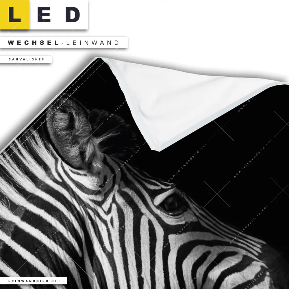 Du konfigurierst Deine individuelle LED Wechsel-Leinwand Canvalight® TEX | Zebra Schwarzweiß | Quadrat und wir produzieren sie NEU für Dich. Unsere Tierwelt Austausch-Fotoleinwände für Canvalight® LED Bilder sind KEINE Lagerware. Du bist Dir unsicher, welches Motiv oder Format das richtige für dein individuelles LED Wechselmotiv auf Leinwand ist, dann helfen wir dir gerne weiter und beraten dich!