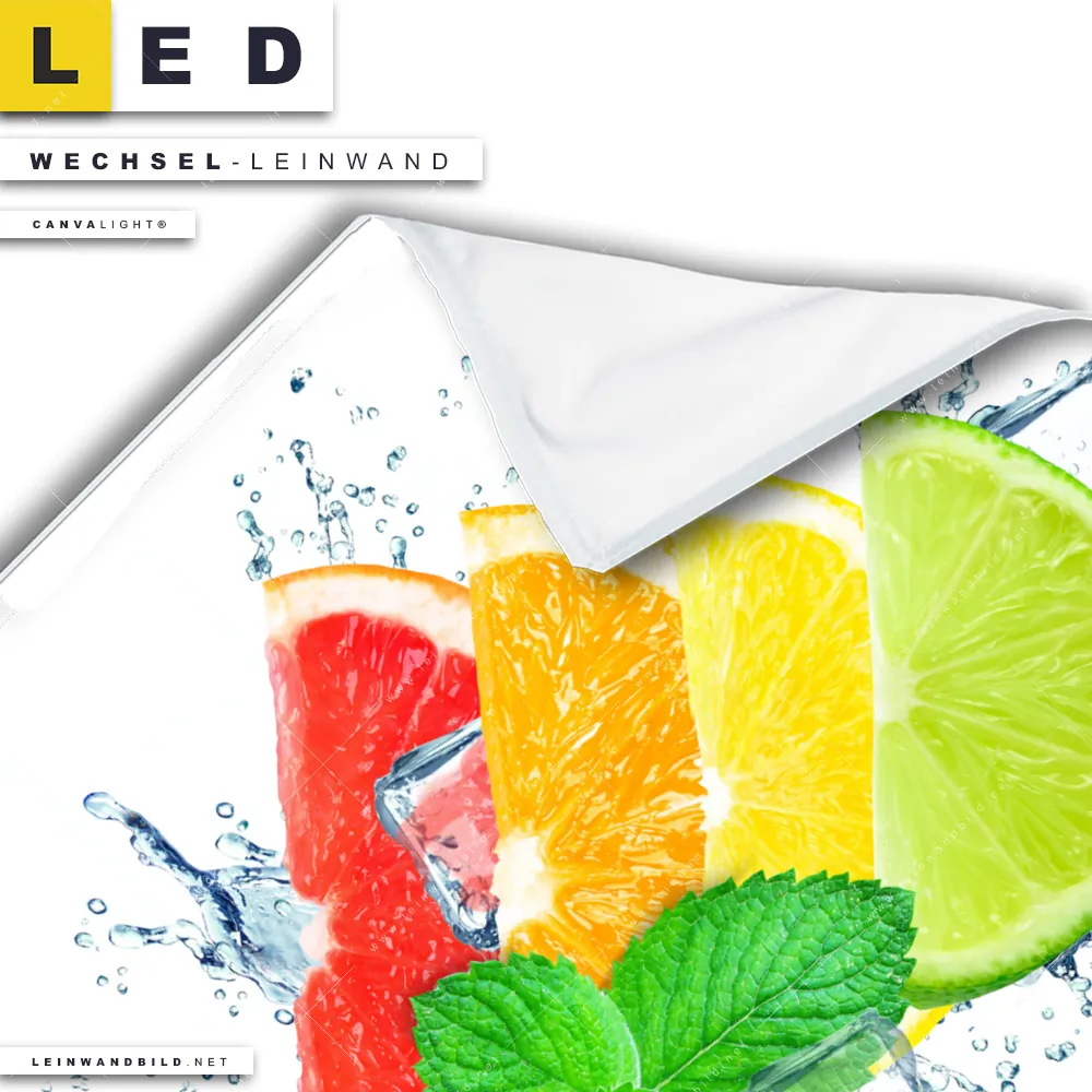 Du bist auf der Suche nach einer Essen - Trinken Wechsel-Leinwand für Dein LED-Leinwandbild im Quadratischen Format? Begriffe wie Obst, Zitrusfrüchte, Früchte, Eiswürfel, Zitrone, frisch, spritzig, Limette, Grapefruit, Orange haben Dich auf der Suche nach Deiner Ersatz-Leinwand für dein LED Wandbild mit wechselbarer Leinwand inspiriert? Farben wie Grün, Orange, Rot, Weiss dürfen auf Deinem neuen Wechselmotiv für Dein XXL Leinwand-LED-Bild nicht fehlen und Leinwände im Mixed Media, Modern Art Stil für Leuchtbilder passen perfekt zu Deinem Einrichtungsstil?
