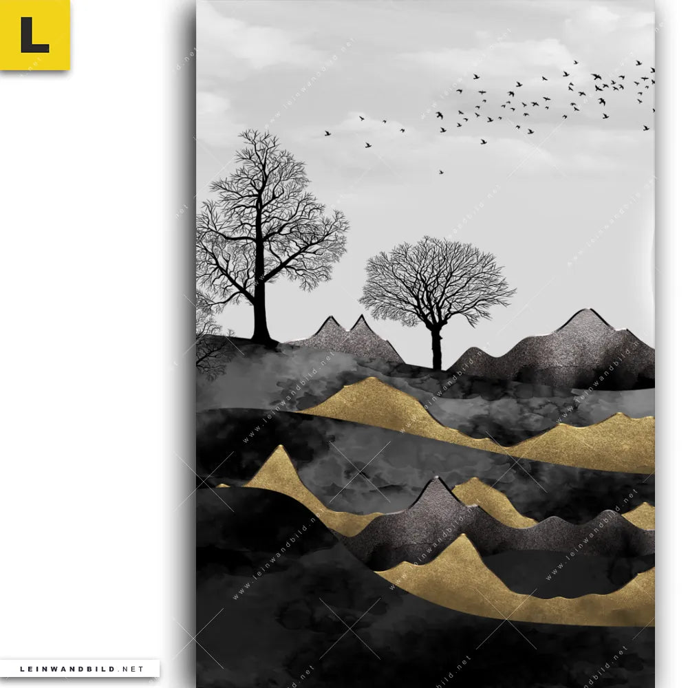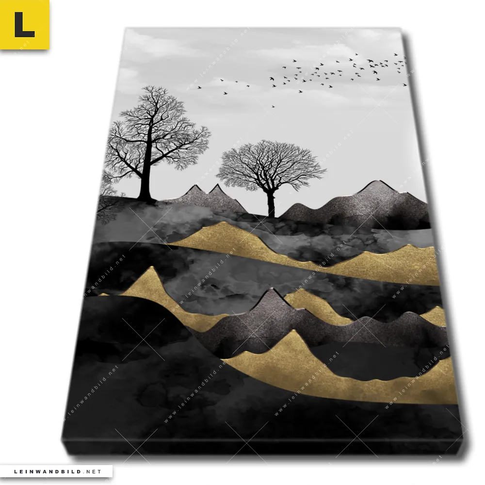 Du bist auf der Suche nach einem XXL Landschaften Leinwandbild und Begriffe wie Abstrakt, Modern, Kunst, Landschaft, Bäume, Wald, Berge, Vögel haben Dich auf der Suche nach Deinem neuen Hochformat Wandbild auf Leinwand inspiriert? Farben wie Weiss, Schwarz, Beige, Gold dürfen auf Deinem neuen vertikalen Keilrahmenbild nicht fehlen und Leinwände im Abstrakt, Modern Art, Schwarz - Weiss Stil passen perfekt zu Deinem Einrichtungsstil?