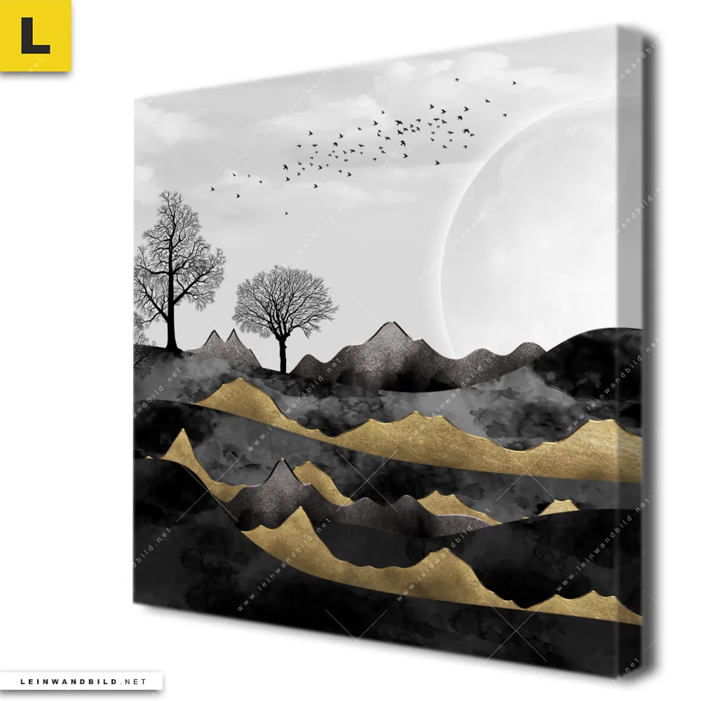 Bitte beachte, dass die Farben, der auf dem Monitor abgebildeten Berglandschaft in schwarz-gold Darstellung, möglicherweise von den Originalfarben abweichen können.