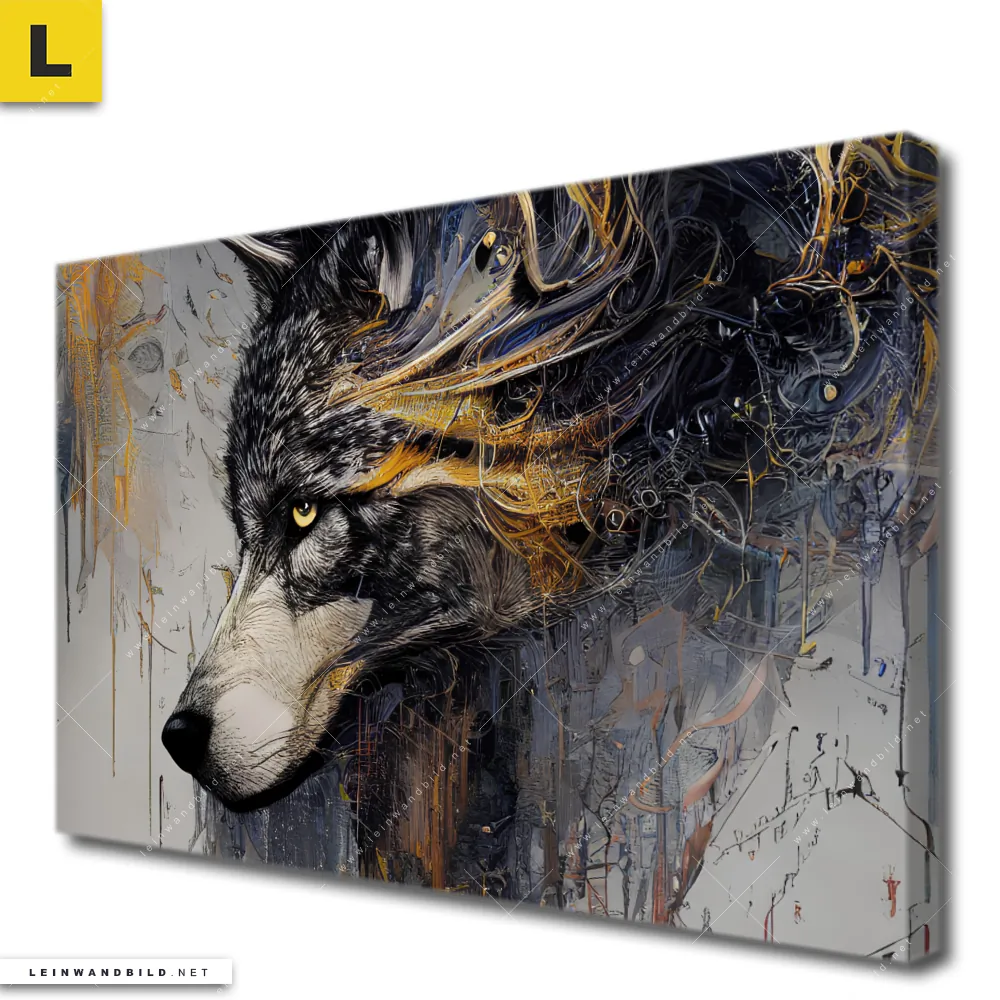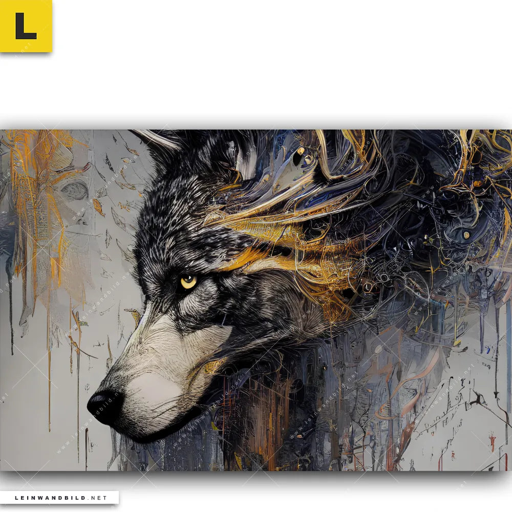 Leinwandbild | Abstrakter Wolf in Gold und Grau | Querformat