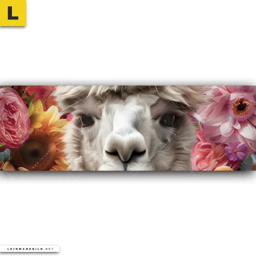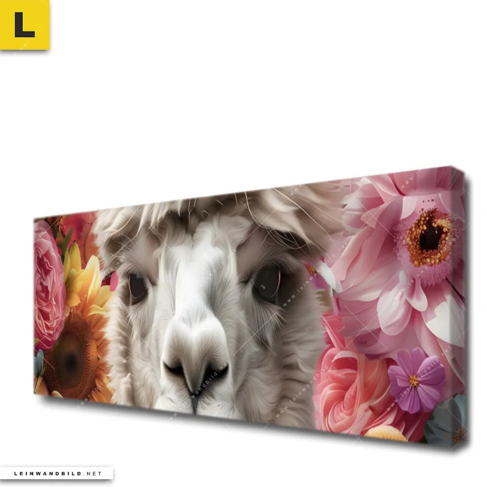 Du konfigurierst Dein individuelles Leinwandbild | Alpaka mit Blumen | Panorama und wir produzieren es NEU für Dich. Unsere Tierwelt, Blumen - Botanik Leinwände sind KEINE Lagerware. Du bist Dir unsicher, welches Motiv oder Format das richtige für dein individuelles Keilrahmenbild ist, dann helfen wir dir gerne weiter und beraten dich!