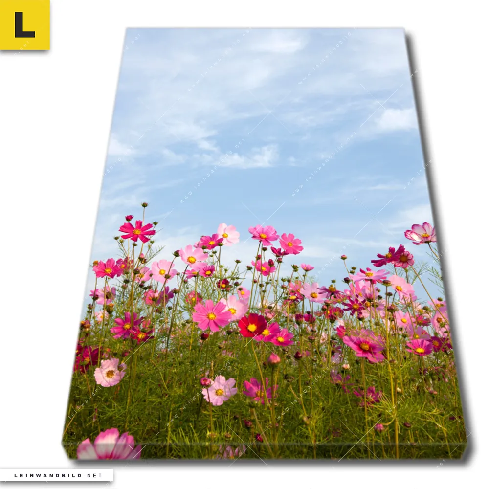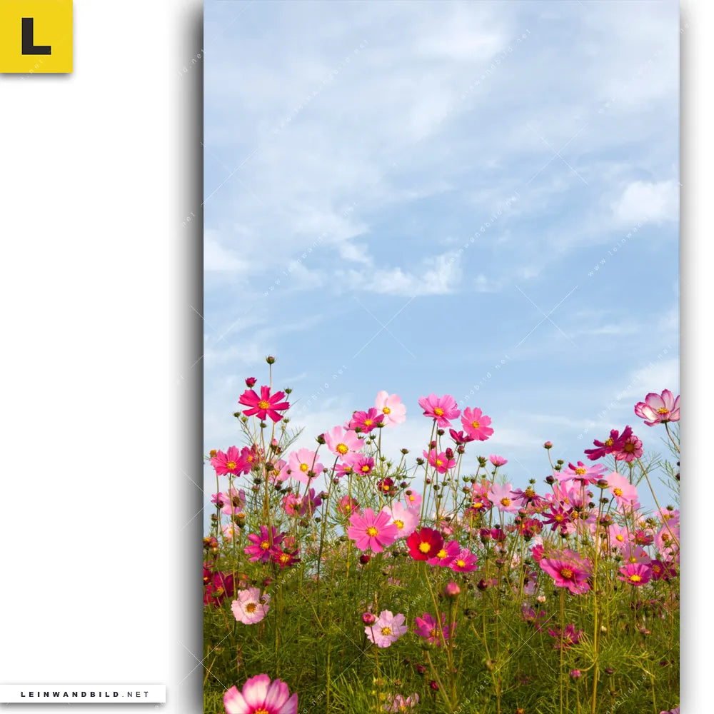 Du konfigurierst Dein individuelles Leinwandbild | Blumenwiese bei strahlend blauem Himmel | Hochformat und wir produzieren es NEU für Dich. Unsere Landschaften, Blumen - Botanik Leinwände sind KEINE Lagerware. Du bist Dir unsicher, welches Motiv oder Format das richtige für dein individuelles Keilrahmenbild ist, dann helfen wir dir gerne weiter und beraten dich!