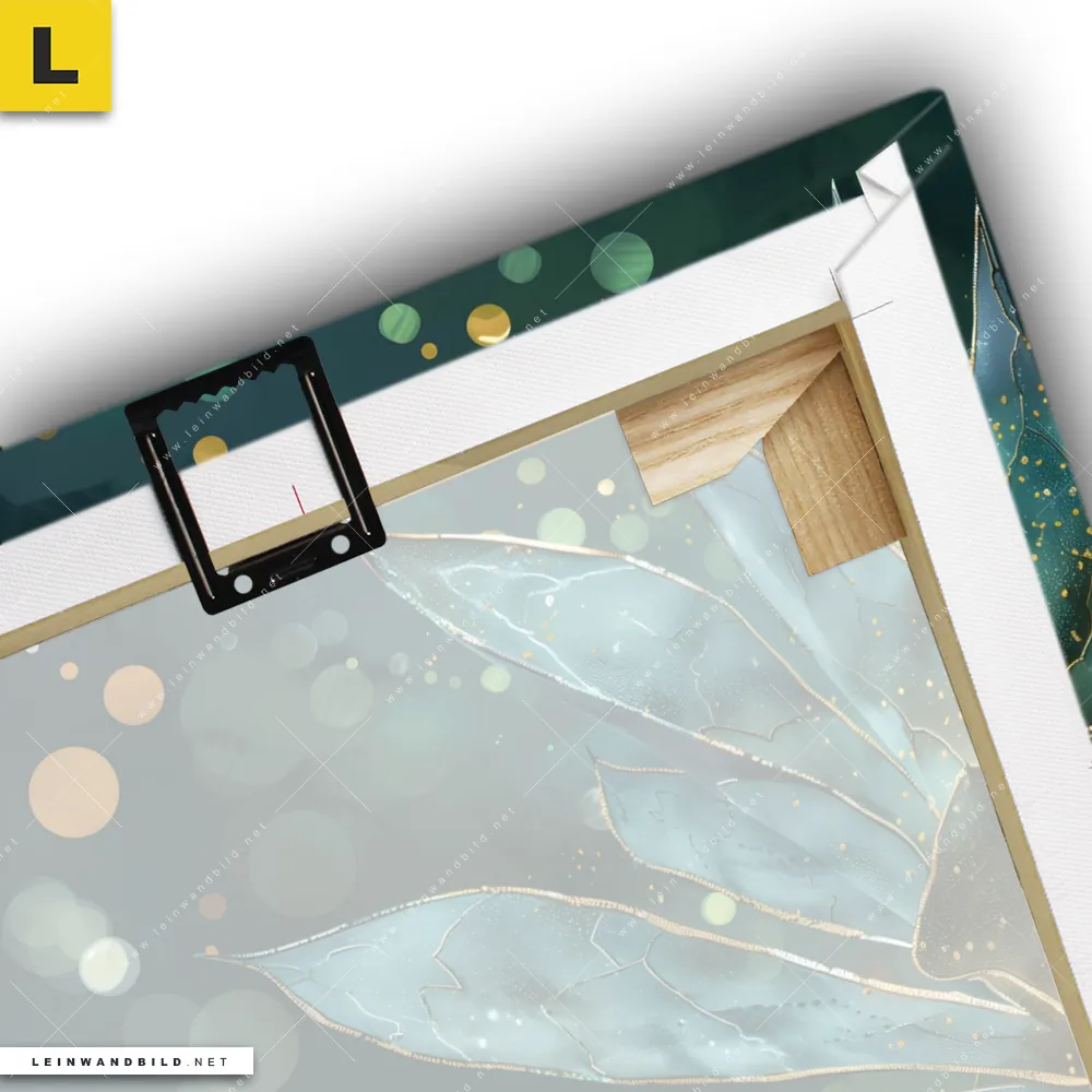 Das Leinwandbild | Botanischer Glanz | Quadrat wird auf 260 g/m² Polyester-Stretch-Canvas gedruckt und überzeugt in den Farben Grün, Gold, Türkis mit hoher Farbintensität, Farbsättigung und langer Farb-Echtheit. Bei der Herstellung unserer Blumen - Botanik Leinwandbilder im Quadrat achten wir stets auf hochwertige Qualität, sowohl im Verarbeitungsprozess als auch bei den Materialien. Die Leinwand mit dem Motiv Magische Blätter im Quadrat wird fix und fertig, auf einem 2cm starken Holzkeilrahmen aufgespannt, geliefert. Vom Druck über den Rahmenbau bis zum Bespannen des Leinwandbildes Leuchtendes Grün mit Blumen, Sukkulente, Kaktus, Pflanze, Natur, Blüten, Glitzer gestaltet als Digitale Kunst, Kunst - Malerei wird bei uns alles in verantwortungsvoller Handarbeit gefertigt.