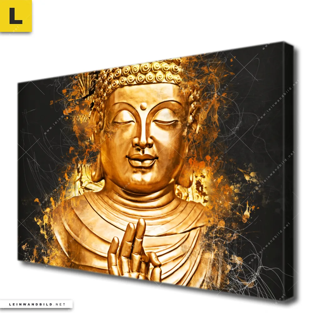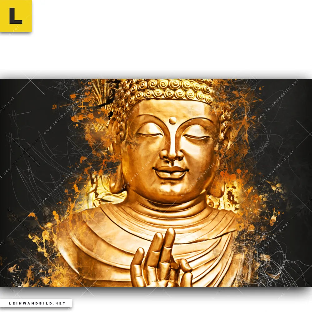 Du bist auf der Suche nach einem XXL Buddha - Feng Shui Leinwandbild und Begriffe wie Buddha, Buddhismus, Religion, Feng Shui, Zen, Meditation, Farbspritzer haben Dich auf der Suche nach Deinem neuen Querformat Wandbild auf Leinwand inspiriert? Farben wie Schwarz, Gold dürfen auf Deinem neuen breiten Keilrahmenbild nicht fehlen und Leinwände im Grunge, Mixed Media, Modern Art, Abstrakt Stil passen perfekt zu Deinem Einrichtungsstil?