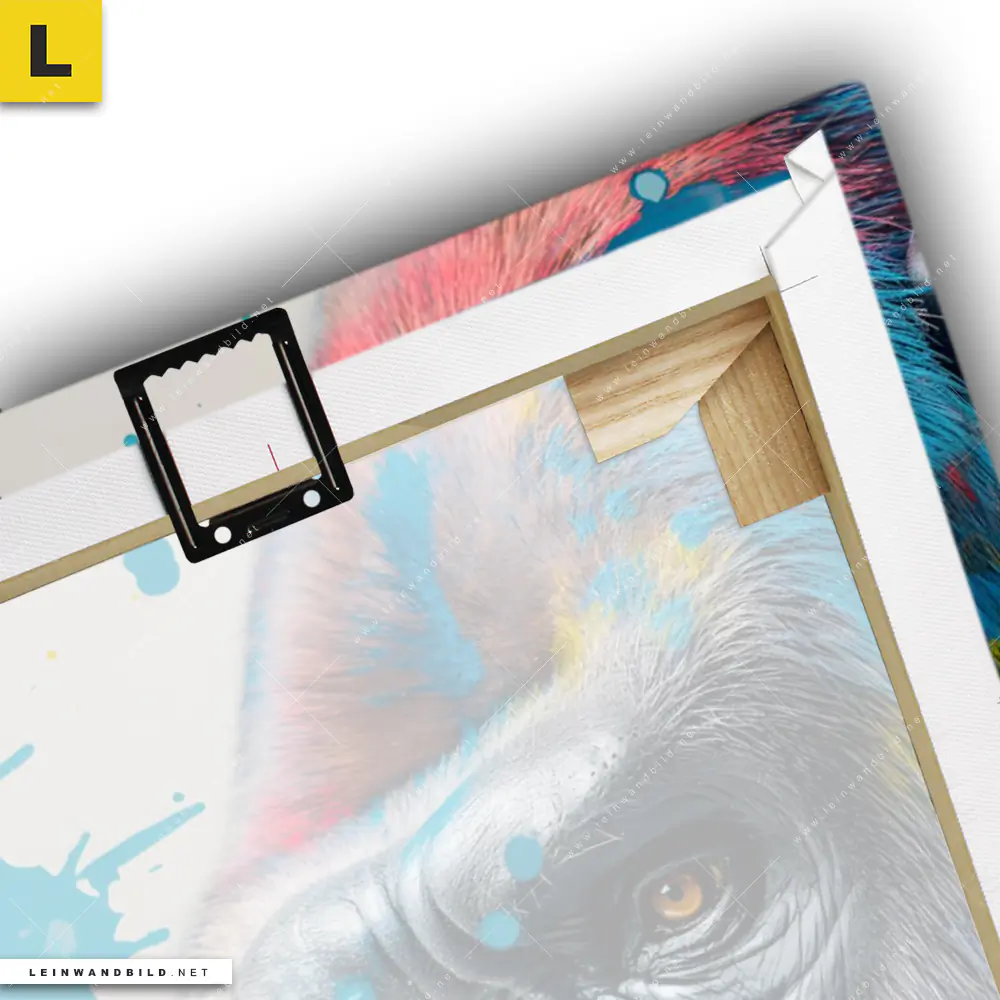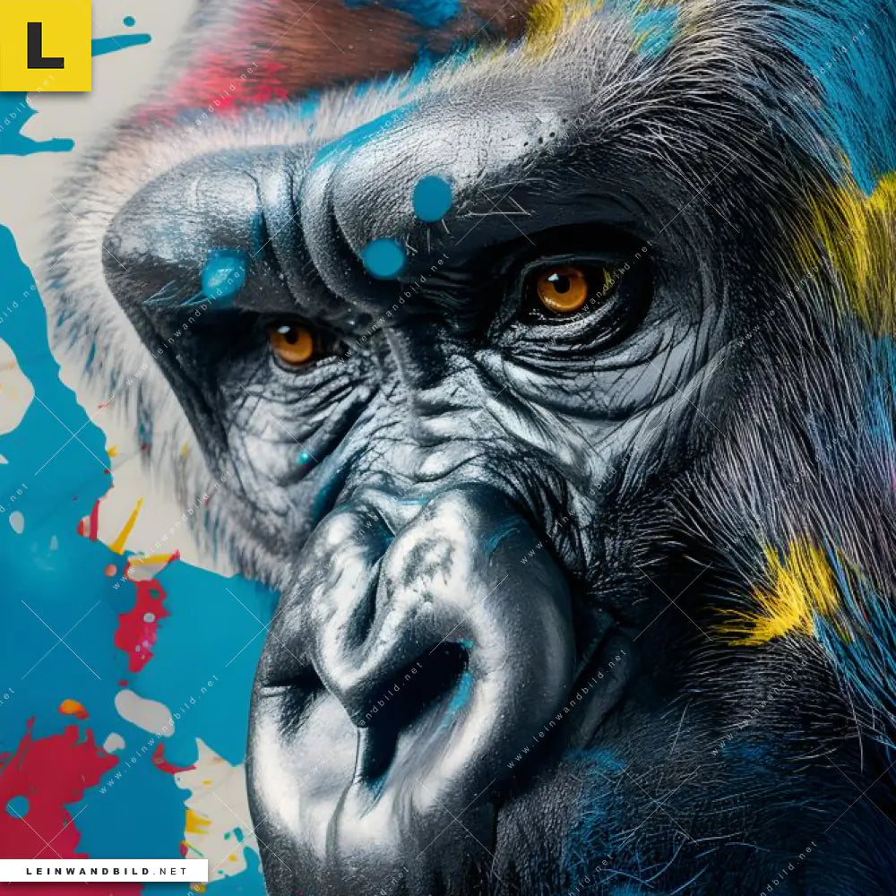 Du konfigurierst Dein individuelles Leinwandbild | Bunter Gorilla mit Farbspritzern | Hochformat und wir produzieren es NEU für Dich. Unsere Tierwelt Leinwände sind KEINE Lagerware. Du bist Dir unsicher, welches Motiv oder Format das richtige für dein individuelles Keilrahmenbild ist, dann helfen wir dir gerne weiter und beraten dich!