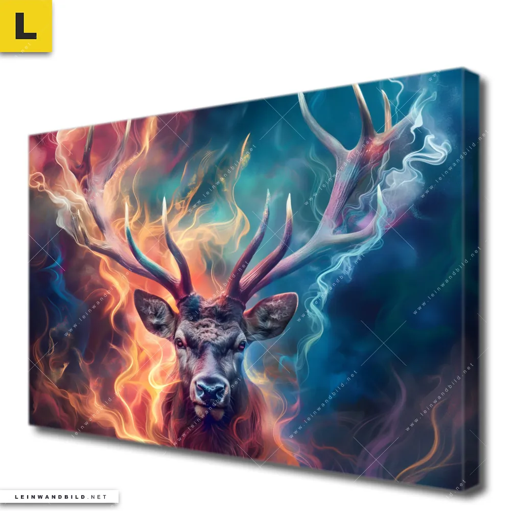 Leinwandbild | Bunter Hirsch in Flammen | Querformat