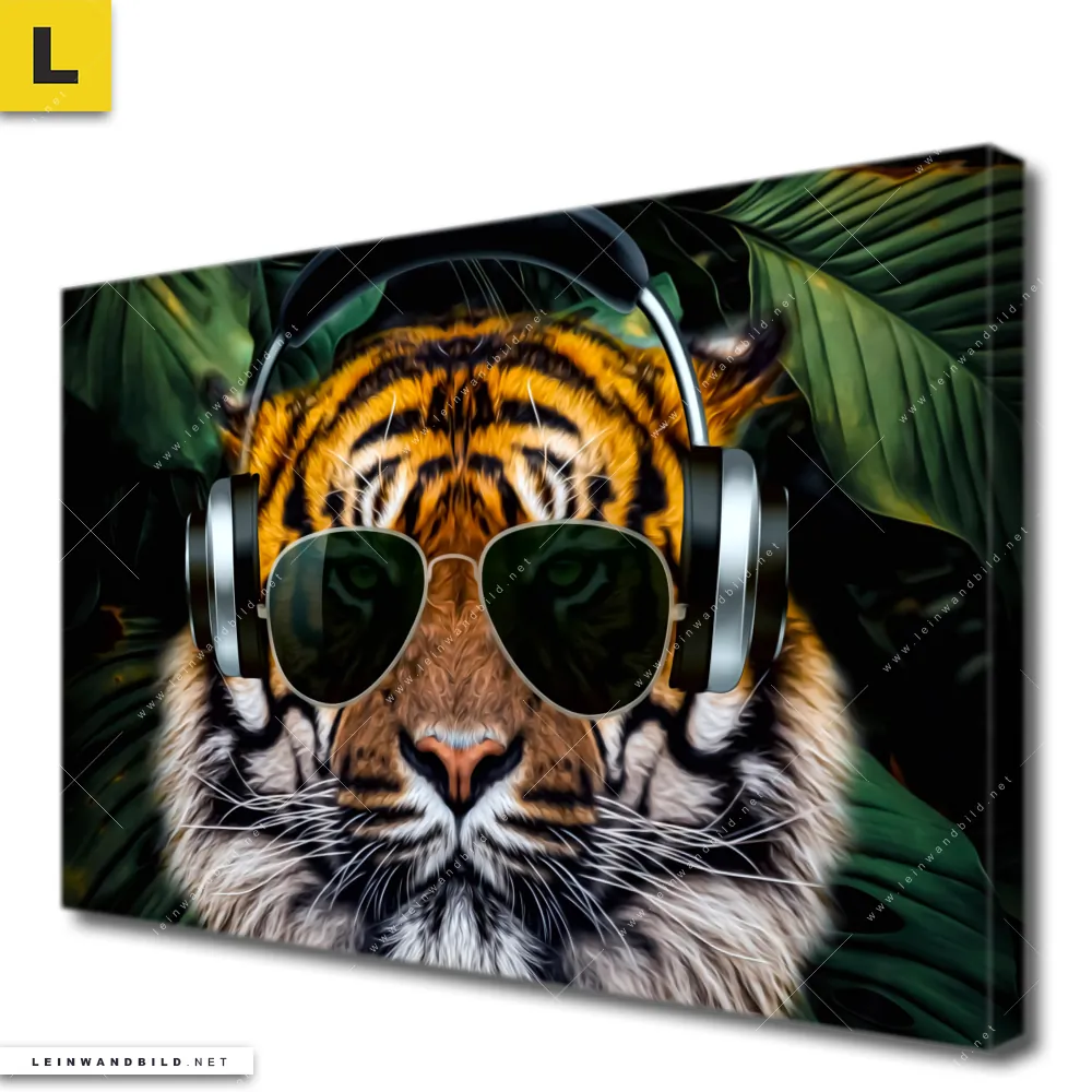 Begriffe wie Raubkatze, Tiger, Afrika, Dschungel, Brille, Sonnenbrille, Blätter, Porträt haben Dich auf der Suche nach Deinem neuen Wandbild auf Leinwand inspiriert? Dann sollte das Leinwandbild Tiger liebt Musik den Weg zu Dir finden.