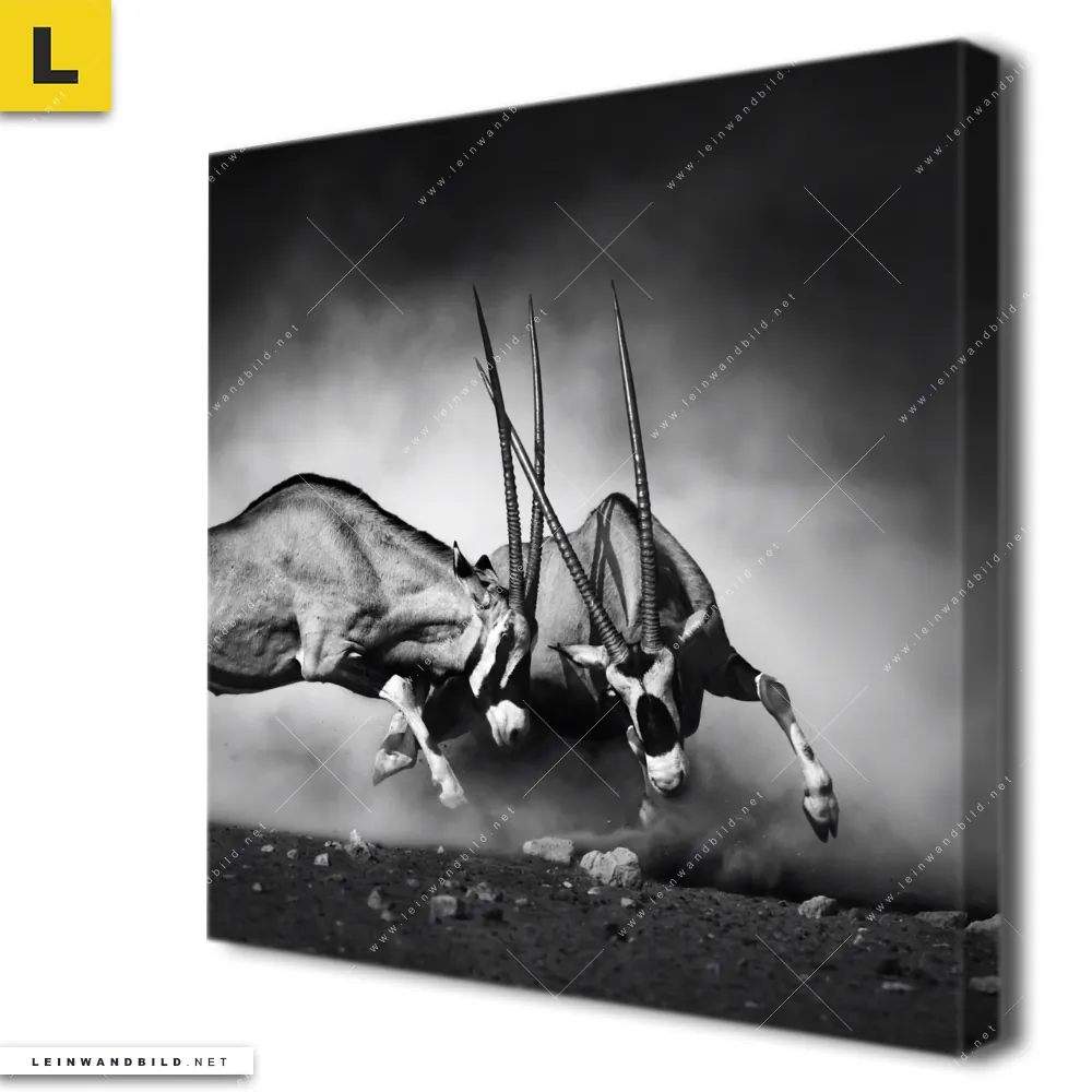 Du bist auf der Suche nach einem XXL Tierwelt Leinwandbild und Begriffe wie Afrika, wild, Safari, Gemsen, Kampf, Duell, Staub, Hirsch haben Dich auf der Suche nach Deinem neuen Quadratischen Wandbild auf Leinwand inspiriert? Farben wie Weiss, Schwarz dürfen auf Deinem neuen Keilrahmenbild nicht fehlen und Leinwände im Natürlich - Realistisch, Schwarz - Weiss Stil passen perfekt zu Deinem Einrichtungsstil?