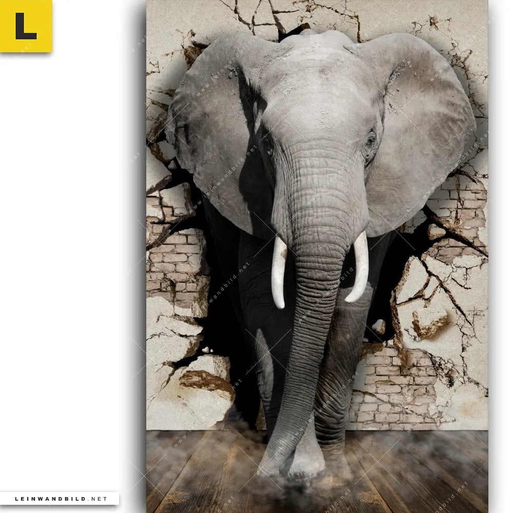 Leinwandbild | Elefant bricht durch Mauer | Hochformat