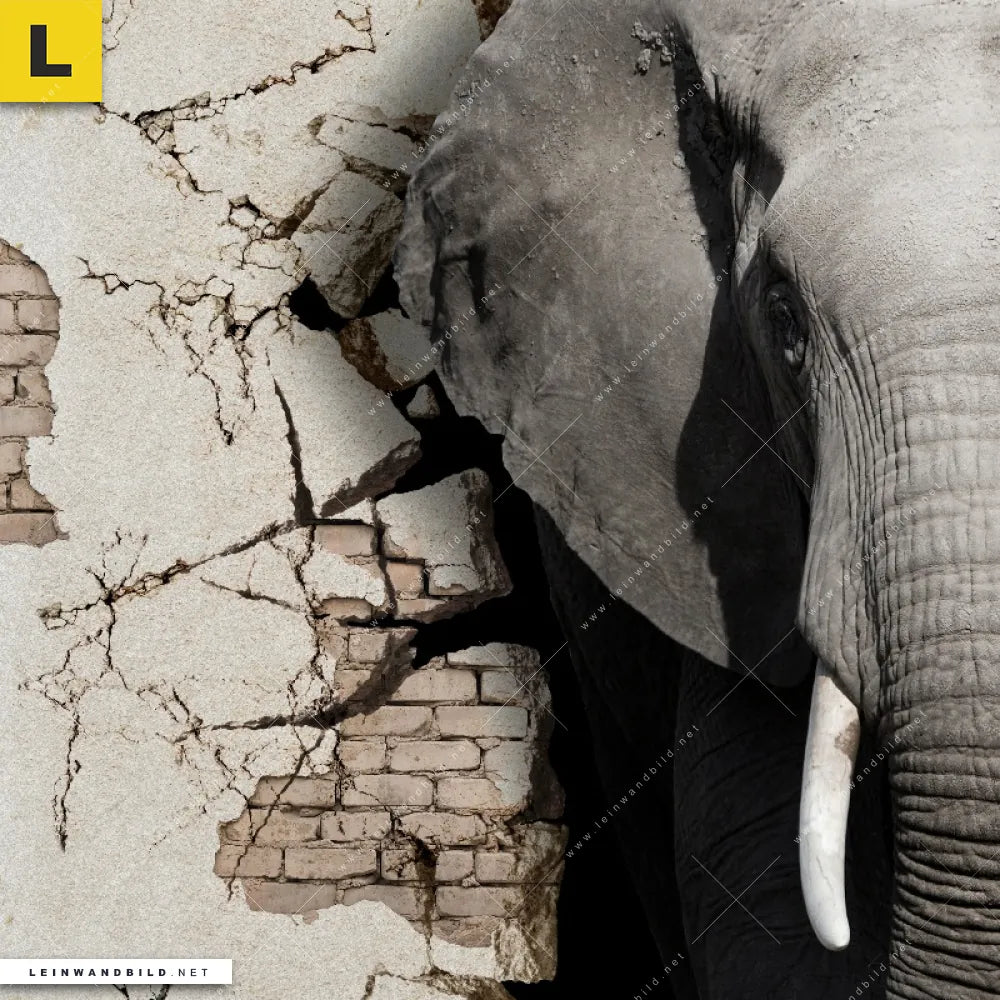 Du konfigurierst Dein individuelles Leinwandbild | Elefant bricht durch Mauer | Hochformat und wir produzieren es NEU für Dich. Unsere Tierwelt Leinwände sind KEINE Lagerware. Du bist Dir unsicher, welches Motiv oder Format das richtige für dein individuelles Keilrahmenbild ist, dann helfen wir dir gerne weiter und beraten dich!