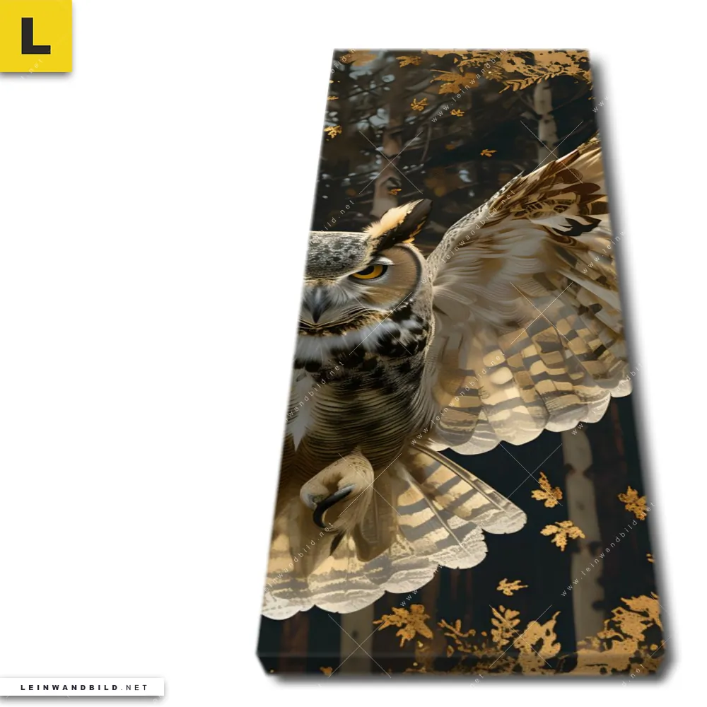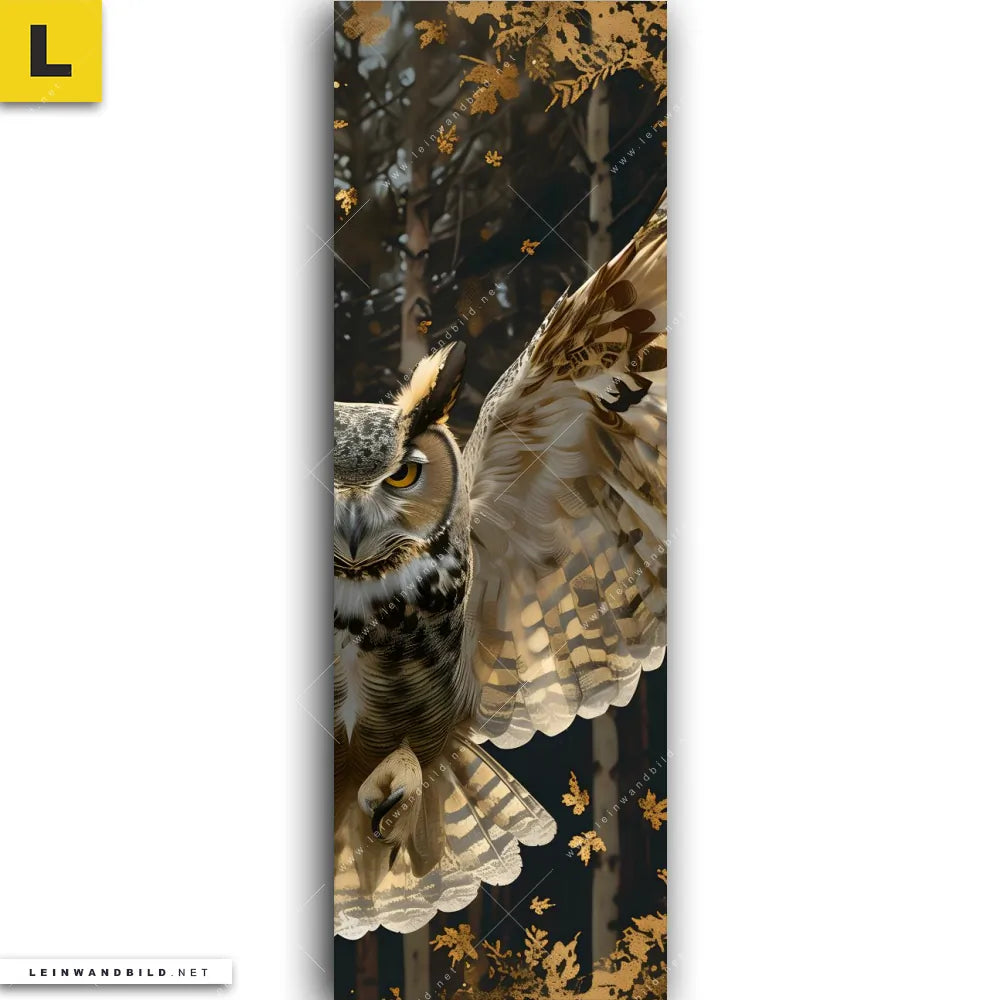 Leinwandbild | Eule inmitten goldener Blätter | Schmal