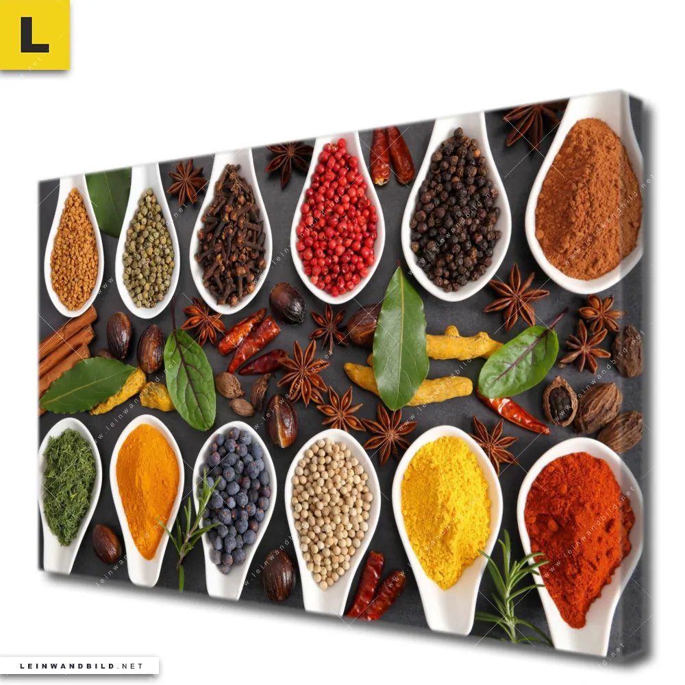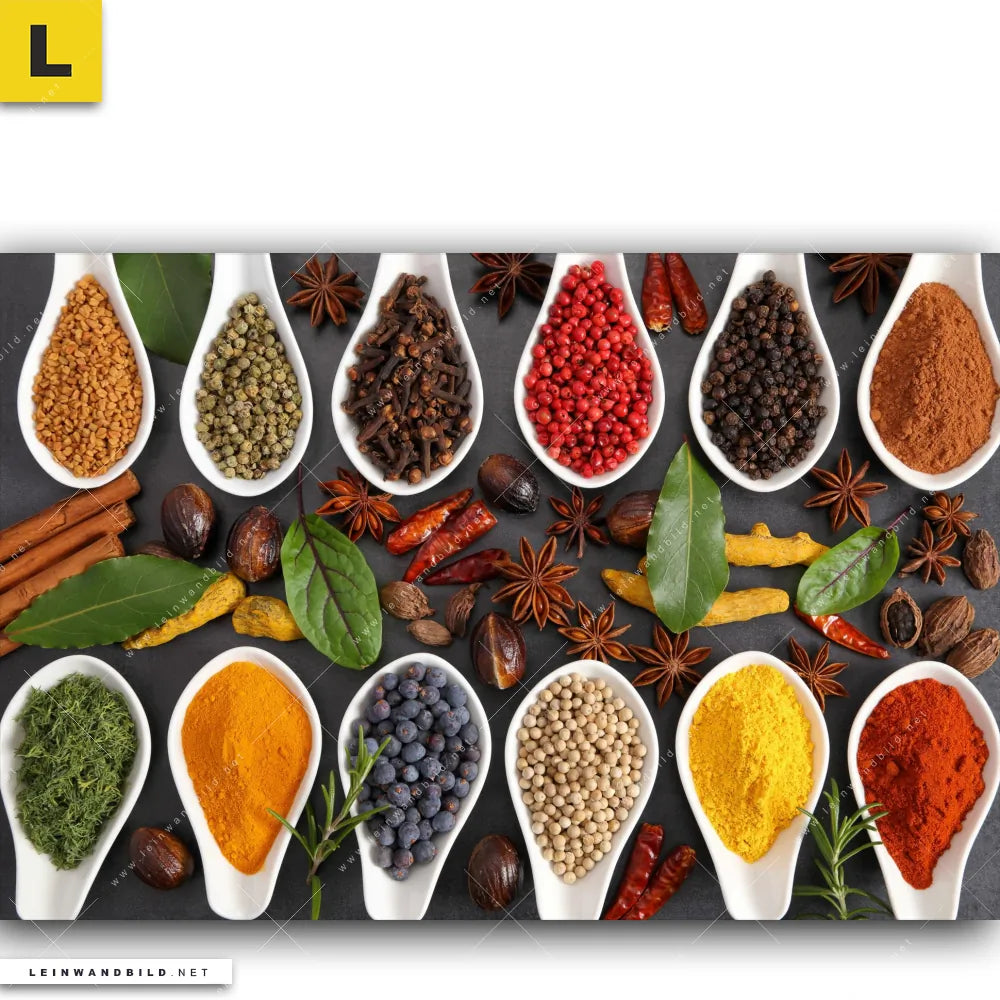 Du bist auf der Suche nach einem XXL Essen - Trinken Leinwandbild und Begriffe wie Gewürze, Kräuter, Löffel, Besteck, Lebensmittel, Geschmack, Indien haben Dich auf der Suche nach Deinem neuen Querformat Wandbild auf Leinwand inspiriert? Farben wie Bunt, Weiss, Blau, Braun, Beige, Gelb , Grün, Lila, Ocker, Orange, Rot, Rosa dürfen auf Deinem neuen breiten Keilrahmenbild nicht fehlen und Leinwände im Natürlich - Realistisch Stil passen perfekt zu Deinem Einrichtungsstil?