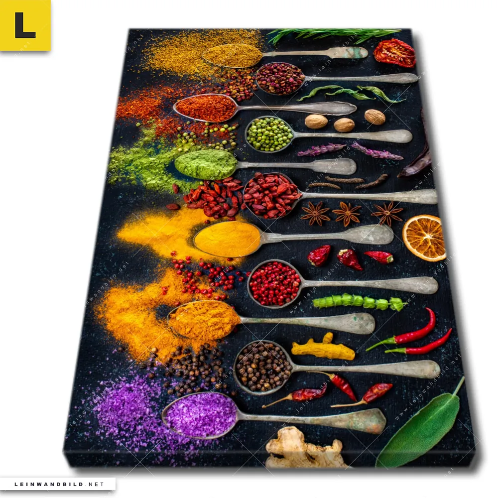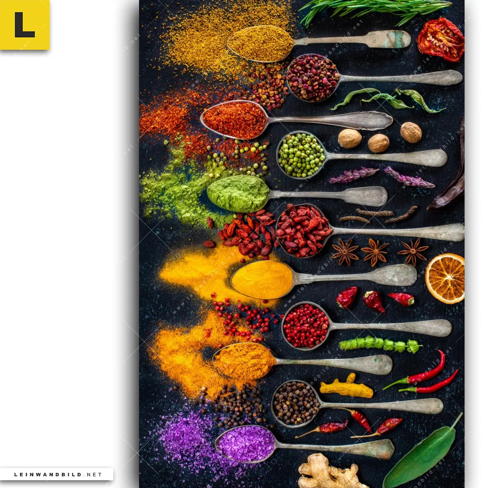 Du konfigurierst Dein individuelles Leinwandbild | Exotische Gewürze auf Löffeln | Hochformat und wir produzieren es NEU für Dich. Unsere Essen - Trinken Leinwände sind KEINE Lagerware. Du bist Dir unsicher, welches Motiv oder Format das richtige für dein individuelles Keilrahmenbild ist, dann helfen wir dir gerne weiter und beraten dich!