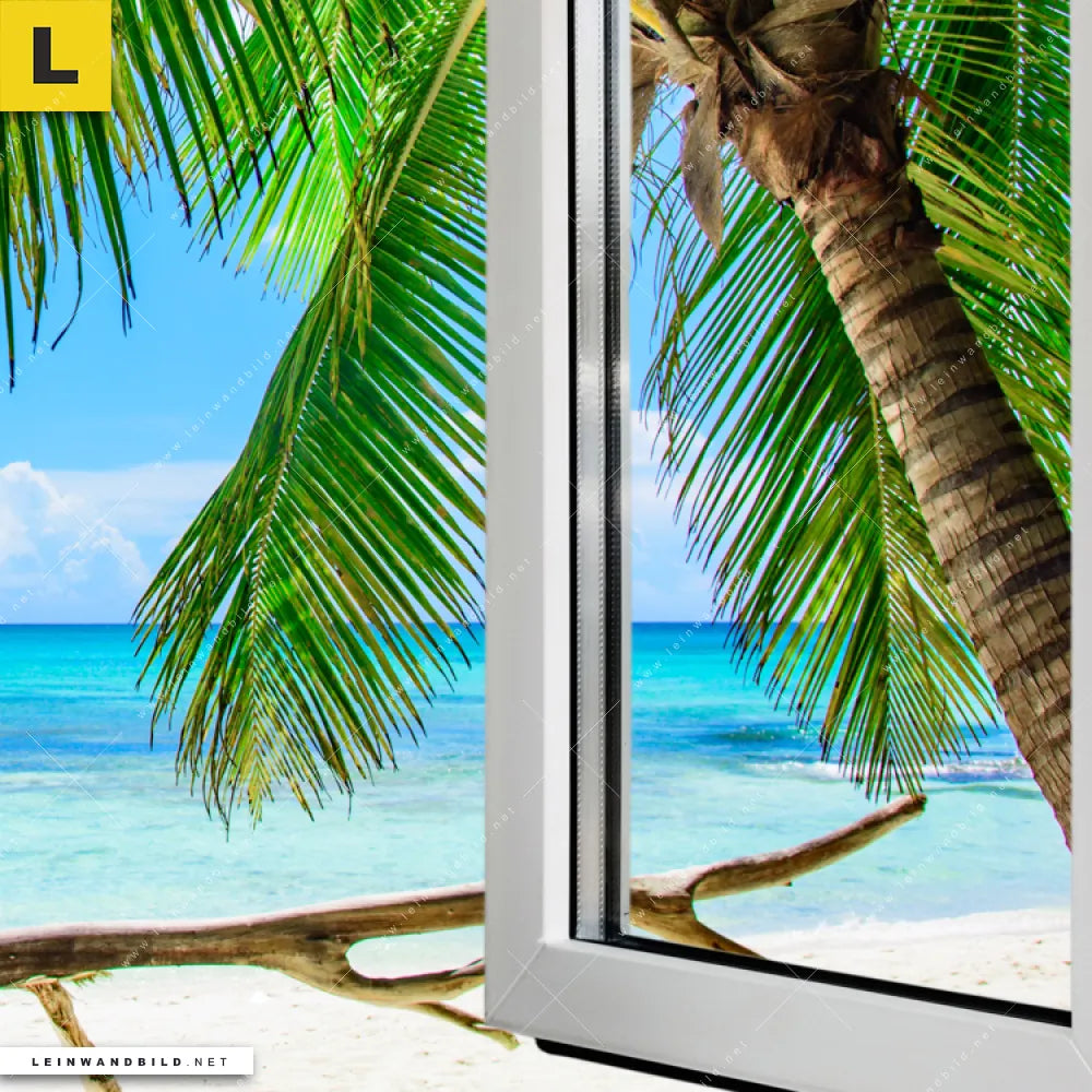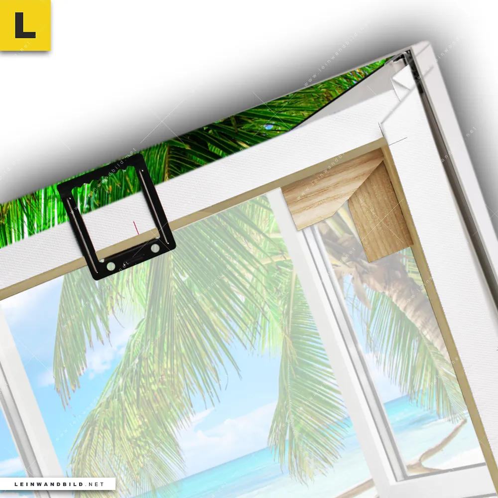 Du konfigurierst Dein individuelles Leinwandbild | Fensterblick Karibik Palme | Querformat und wir produzieren es NEU für Dich. Unsere Landschaften, Strand - Meer Leinwände sind KEINE Lagerware. Du bist Dir unsicher, welches Motiv oder Format das richtige für dein individuelles Keilrahmenbild ist, dann helfen wir dir gerne weiter und beraten dich!