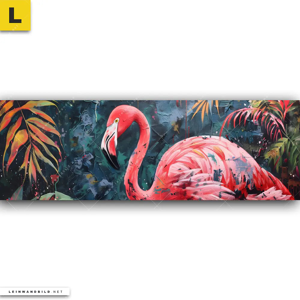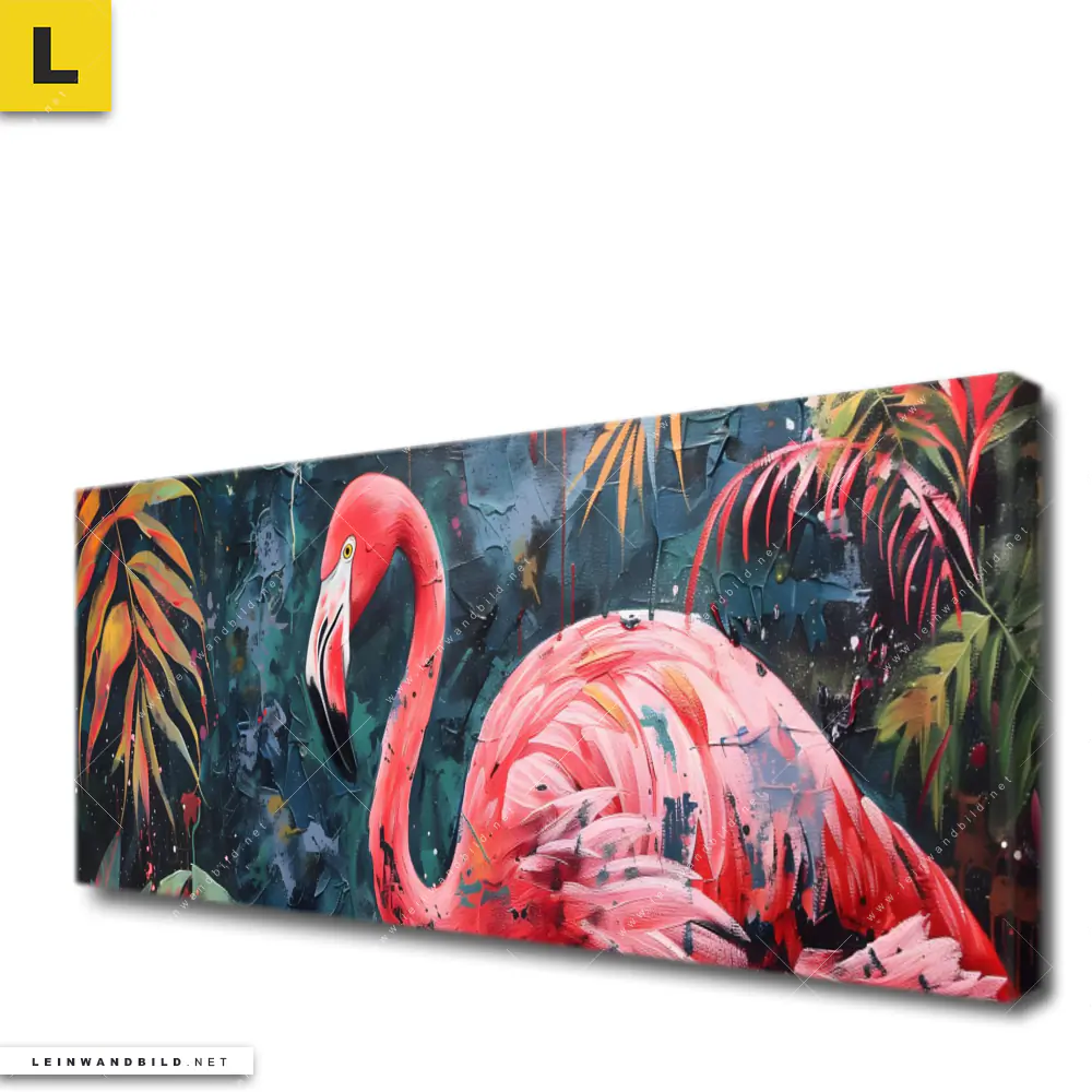 Du bist auf der Suche nach einem XXL Tierwelt, Blumen - Botanik Leinwandbild und Begriffe wie Flamingo, Vogel, Tierporträt, Dschungel, Farbe, Blätter, Pflanzen, Regenwald haben Dich auf der Suche nach Deinem neuen Panorama Wandbild auf Leinwand inspiriert? Farben wie Pink, Schwarz, Rosa, Grün dürfen auf Deinem neuen extra breiten Keilrahmenbild nicht fehlen und Leinwände im Abstrakt, Modern Art, Floral Stil passen perfekt zu Deinem Einrichtungsstil?