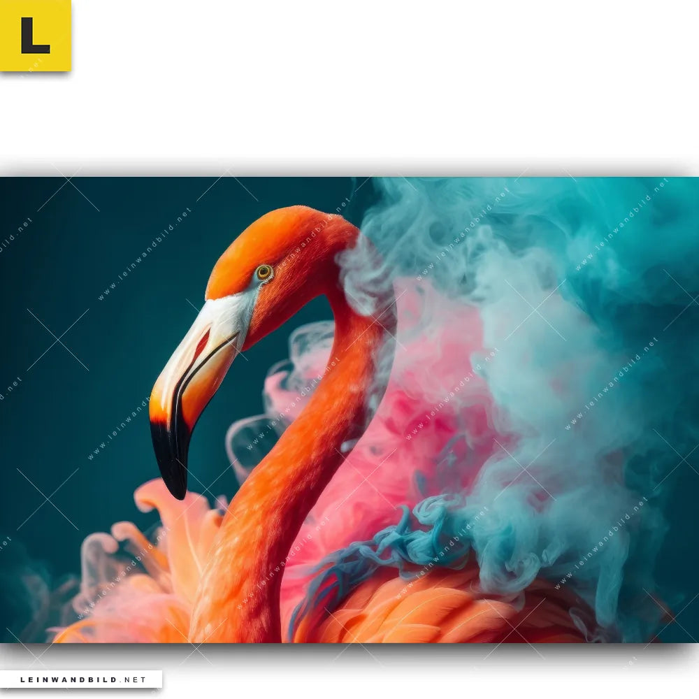 Du konfigurierst Dein individuelles Leinwandbild | Flamingo in bunter Rauchwolke | Querformat und wir produzieren es NEU für Dich. Unsere Tierwelt Leinwände sind KEINE Lagerware. Du bist Dir unsicher, welches Motiv oder Format das richtige für dein individuelles Keilrahmenbild ist, dann helfen wir dir gerne weiter und beraten dich!