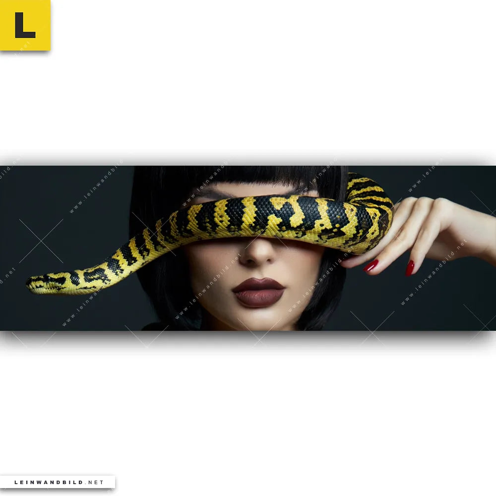 Du konfigurierst Dein individuelles Leinwandbild | Frau mit gelber Schlange | Panorama und wir produzieren es NEU für Dich. Unsere Porträts - Menschen, Tierwelt Leinwände sind KEINE Lagerware. Du bist Dir unsicher, welches Motiv oder Format das richtige für dein individuelles Keilrahmenbild ist, dann helfen wir dir gerne weiter und beraten dich!