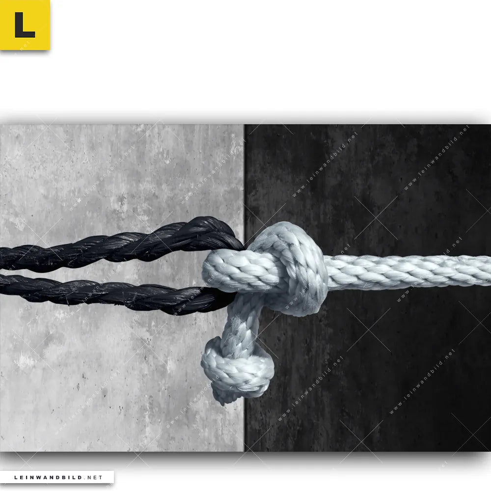 Das Leinwandbild | Freundschaft & Respekt | Querformat wird auf 260 g/m² Polyester-Stretch-Canvas gedruckt und überzeugt in den Farben Weiss, Schwarz mit hoher Farbintensität, Farbsättigung und langer Farb-Echtheit. Bei der Herstellung unserer Porträts - Menschen, Buddha - Feng Shui Leinwandbilder im Querformat achten wir stets auf hochwertige Qualität, sowohl im Verarbeitungsprozess als auch bei den Materialien. Die Leinwand mit dem Motiv symbolisch verknotete Seile im Querformat wird fix und fertig, auf einem 2cm starken Holzkeilrahmen aufgespannt, geliefert. Vom Druck über den Rahmenbau bis zum Bespannen des Leinwandbildes Symbolbild mit Seilen mit Yin Yang, Feng Shui, Buddhismus, Meditation, Zen, Religion gestaltet als Digitale Kunst, Fotografie wird bei uns alles in verantwortungsvoller Handarbeit gefertigt.
