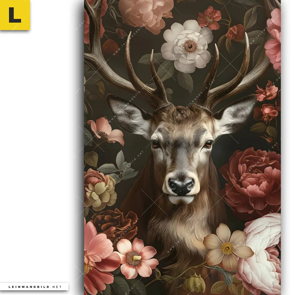 Leinwandbild | Friedlicher Hirsch und Blüten | Hochformat