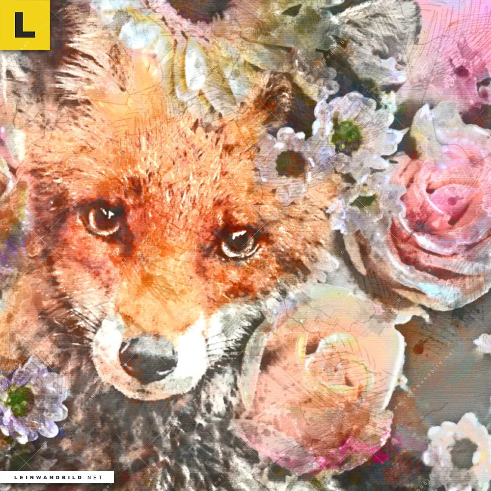 Bitte beachte, dass die Farben, der auf dem Monitor abgebildeten Aquarellgemälde eines Fuchses mit Blumen Darstellung, möglicherweise von den Originalfarben abweichen können.