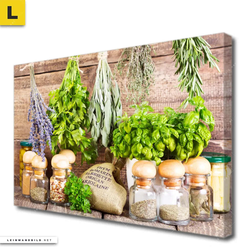 Du bist auf der Suche nach einem XXL Essen - Trinken Leinwandbild und Begriffe wie Gewürze, Kräuter, kochen, Lebensmittel, mediterran, Rosmarin, Flaschen, gesund, Stillleben, Kräuterbeet, Thymian, Salbei, Lavendel haben Dich auf der Suche nach Deinem neuen Querformat Wandbild auf Leinwand inspiriert? Farben wie Grün, Beige, Braun dürfen auf Deinem neuen breiten Keilrahmenbild nicht fehlen und Leinwände im Modern Art, Natürlich - Realistisch Stil passen perfekt zu Deinem Einrichtungsstil?