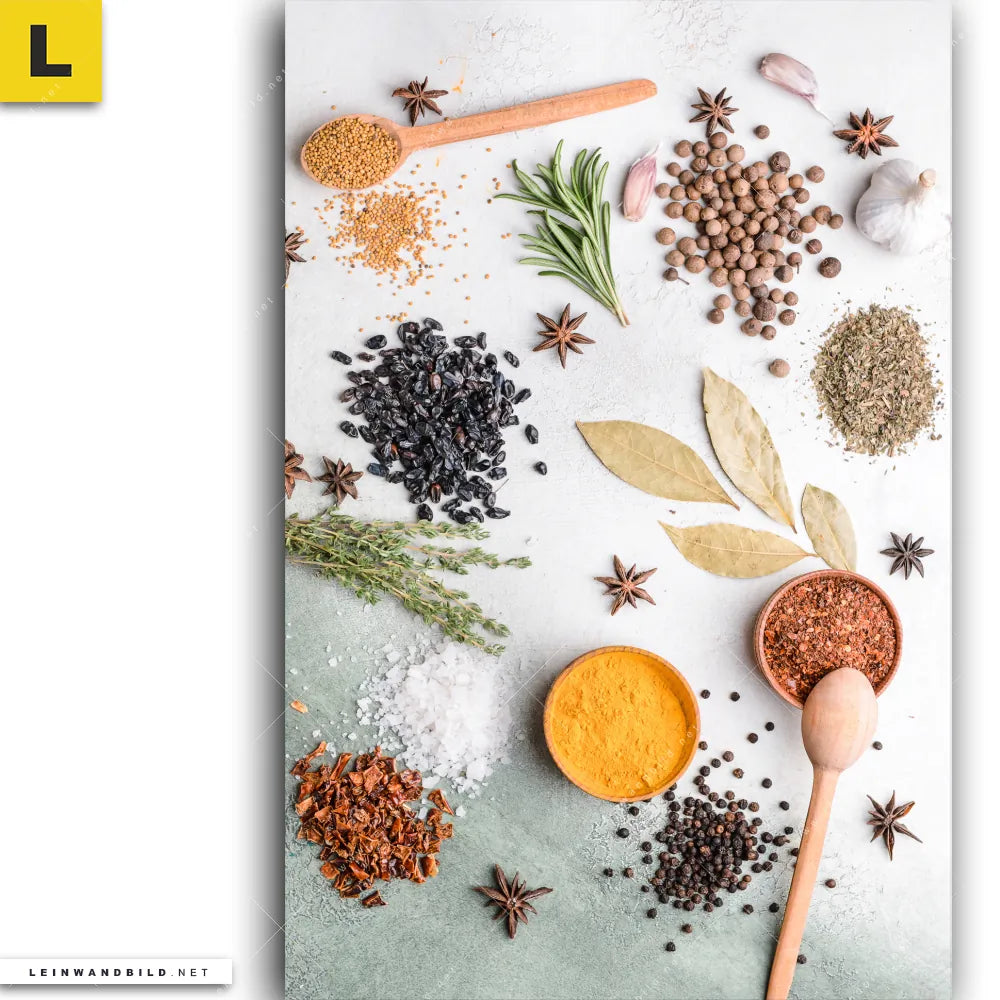 Du konfigurierst Dein individuelles Leinwandbild | Gewürze auf hellem Untergrund | Hochformat und wir produzieren es NEU für Dich. Unsere Essen - Trinken Leinwände sind KEINE Lagerware. Du bist Dir unsicher, welches Motiv oder Format das richtige für dein individuelles Keilrahmenbild ist, dann helfen wir dir gerne weiter und beraten dich!