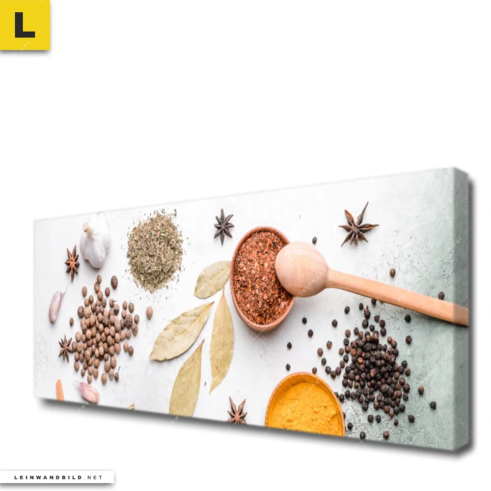 Du konfigurierst Dein individuelles Leinwandbild | Gewürze auf hellem Untergrund | Panorama und wir produzieren es NEU für Dich. Unsere Essen - Trinken Leinwände sind KEINE Lagerware. Du bist Dir unsicher, welches Motiv oder Format das richtige für dein individuelles Keilrahmenbild ist, dann helfen wir dir gerne weiter und beraten dich!