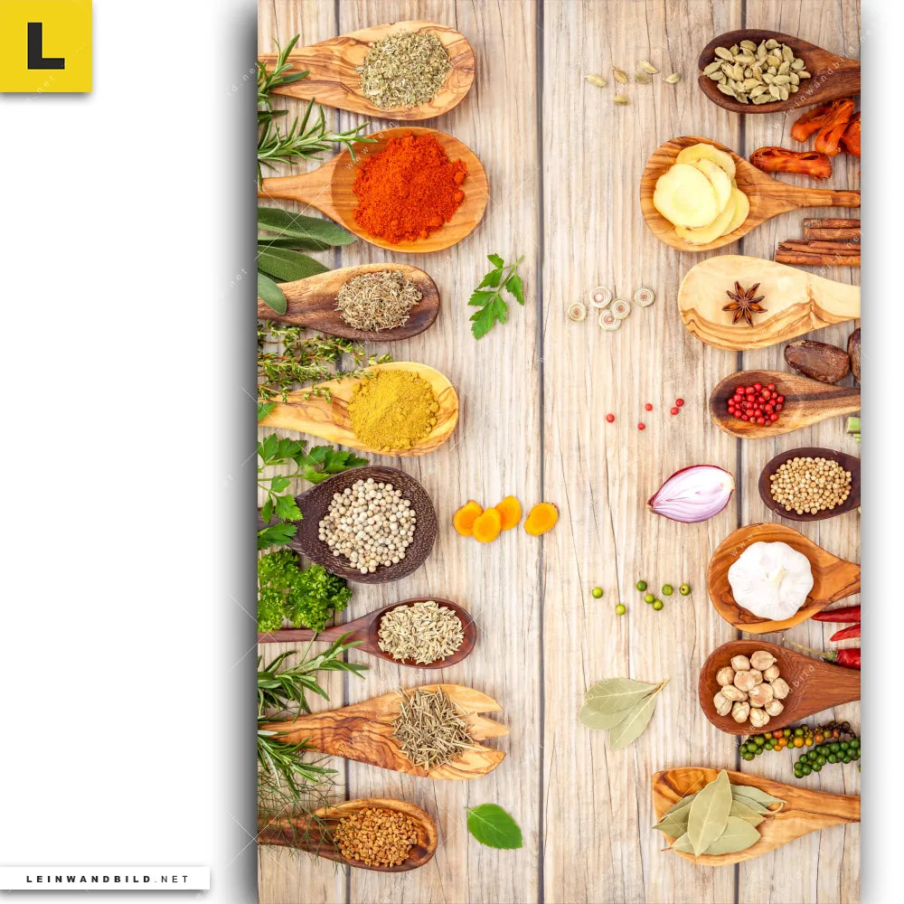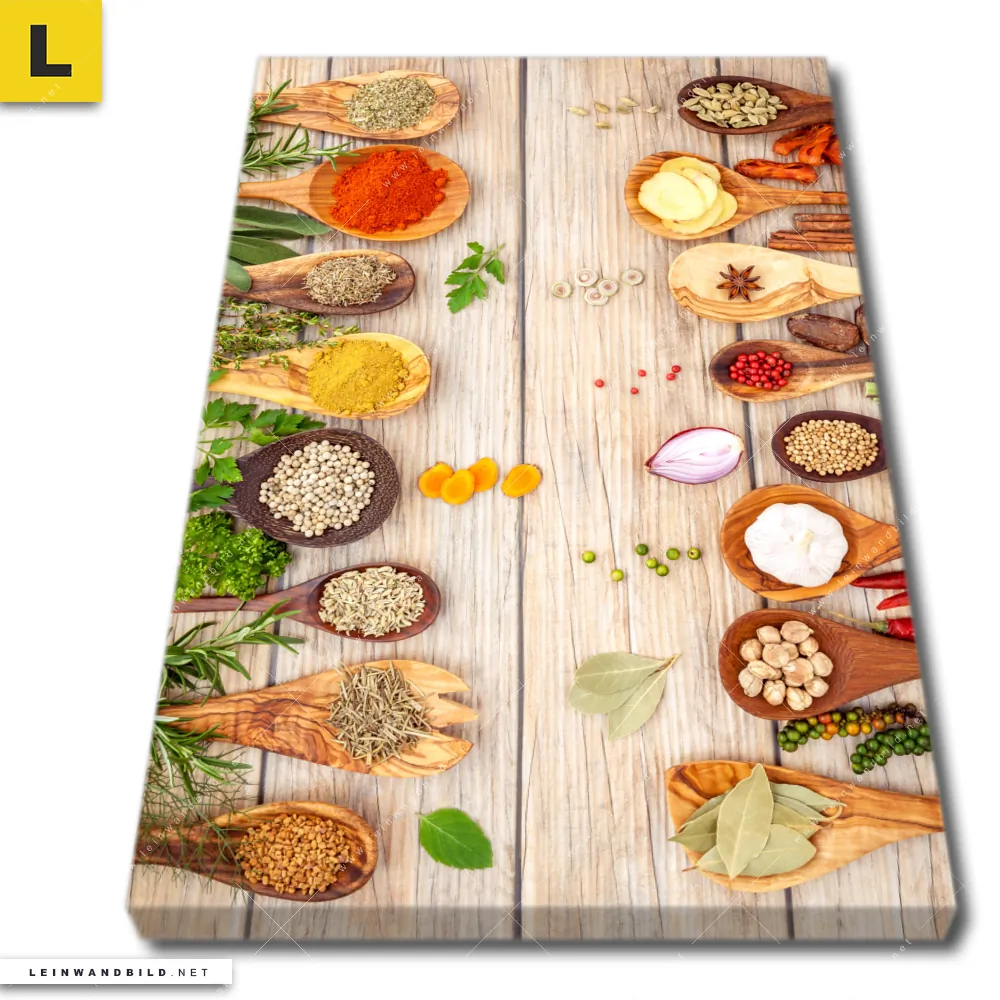 Du konfigurierst Dein individuelles Leinwandbild | Gewürze auf hölzernen Löffeln | Hochformat und wir produzieren es NEU für Dich. Unsere Essen - Trinken Leinwände sind KEINE Lagerware. Du bist Dir unsicher, welches Motiv oder Format das richtige für dein individuelles Keilrahmenbild ist, dann helfen wir dir gerne weiter und beraten dich!