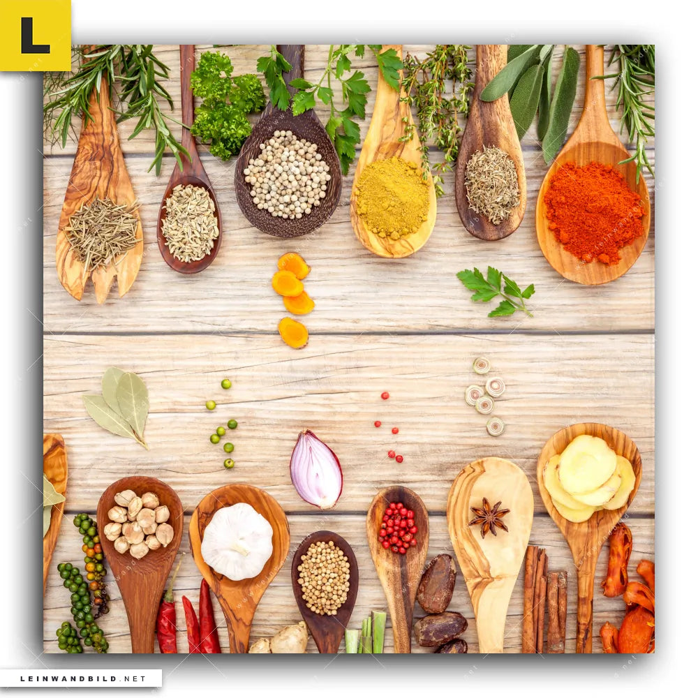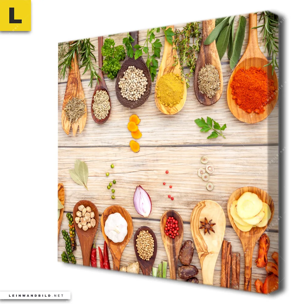 Du konfigurierst Dein individuelles Leinwandbild | Gewürze auf hölzernen Löffeln | Quadrat und wir produzieren es NEU für Dich. Unsere Essen - Trinken Leinwände sind KEINE Lagerware. Du bist Dir unsicher, welches Motiv oder Format das richtige für dein individuelles Keilrahmenbild ist, dann helfen wir dir gerne weiter und beraten dich!