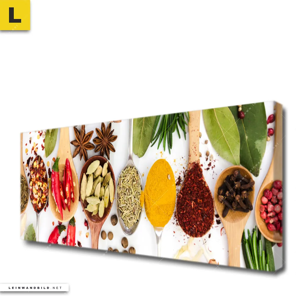 Du konfigurierst Dein individuelles Leinwandbild | Gewürze auf Löffeln - weiß | Panorama und wir produzieren es NEU für Dich. Unsere Essen - Trinken Leinwände sind KEINE Lagerware. Du bist Dir unsicher, welches Motiv oder Format das richtige für dein individuelles Keilrahmenbild ist, dann helfen wir dir gerne weiter und beraten dich!