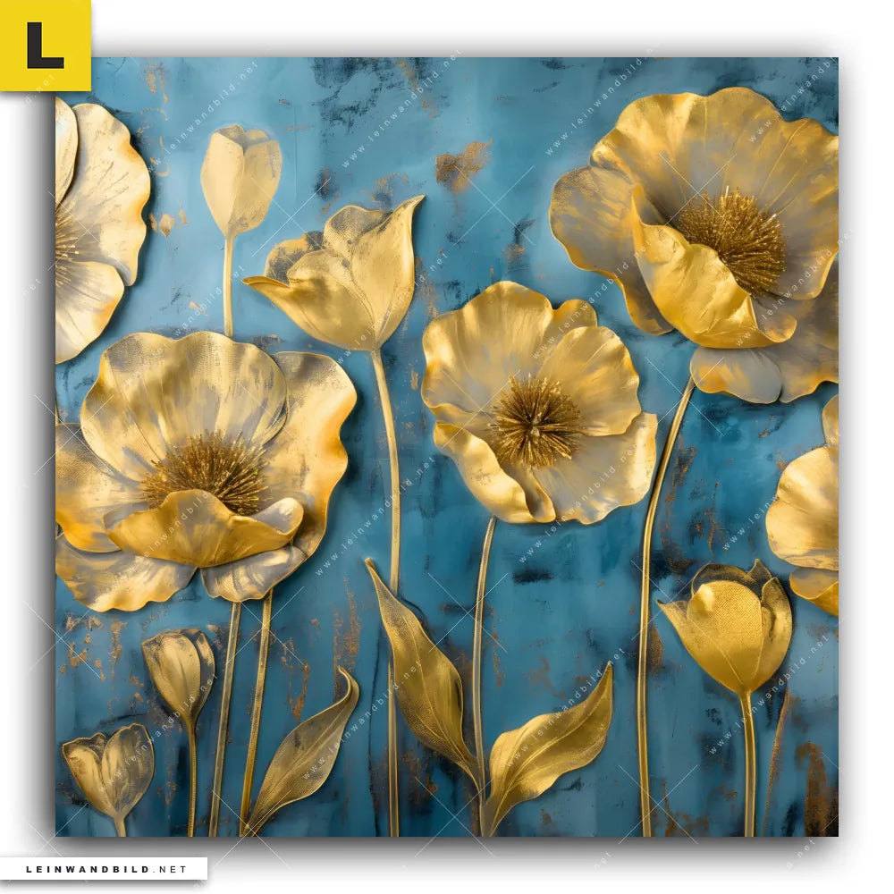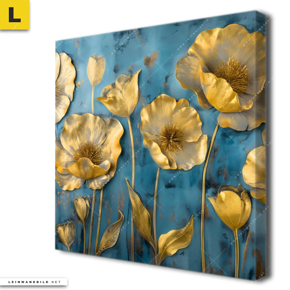 Du konfigurierst Dein individuelles Leinwandbild | Goldene Blumen auf Blau | Quadrat und wir produzieren es NEU für Dich. Unsere Blumen - Botanik Leinwände sind KEINE Lagerware. Du bist Dir unsicher, welches Motiv oder Format das richtige für dein individuelles Keilrahmenbild ist, dann helfen wir dir gerne weiter und beraten dich!