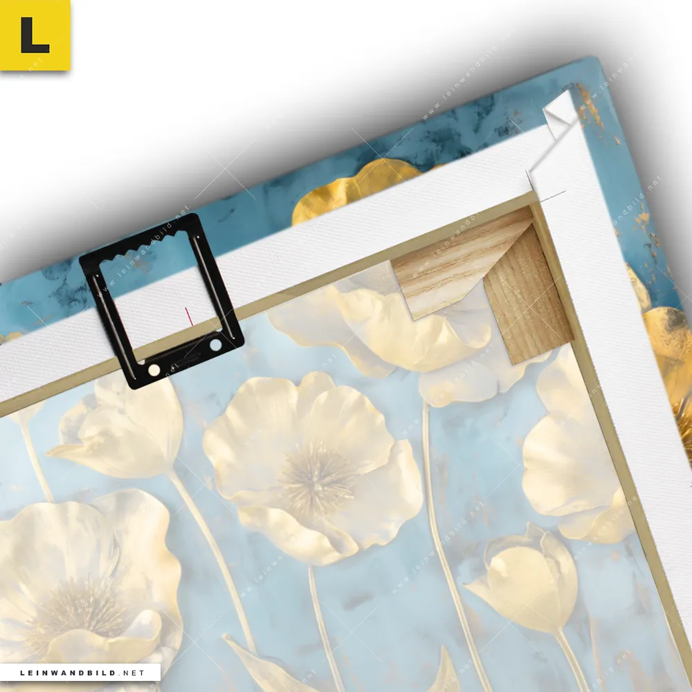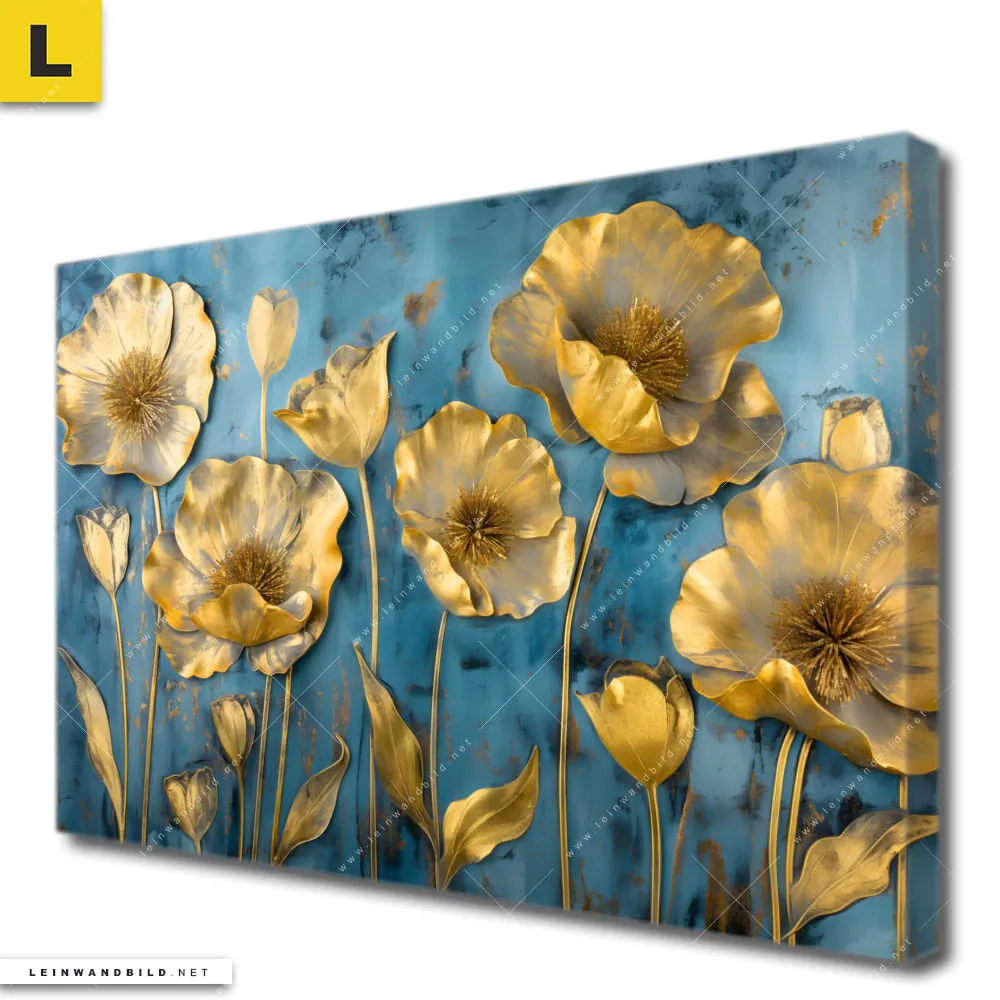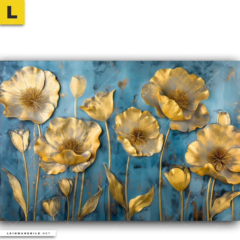 Dann sollte das Leinwandbild | Goldene Blumen auf Blau | Querformat den Weg zu Dir finden. Die moderne Fotoleinwand Goldene Mohn-Blüten fügt sich als Eye-Catcher harmonisch in jedes Flur - Eingangsbereich, Wohnzimmer - Schlafzimmer, Arzt - Praxis Raumkonzept ein.