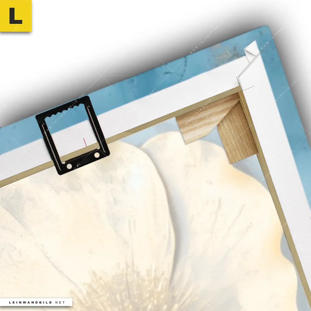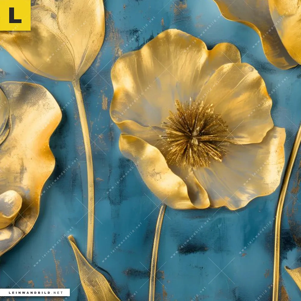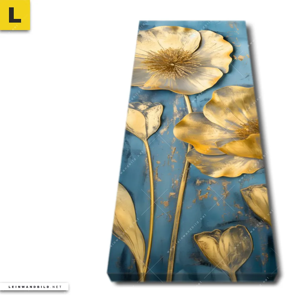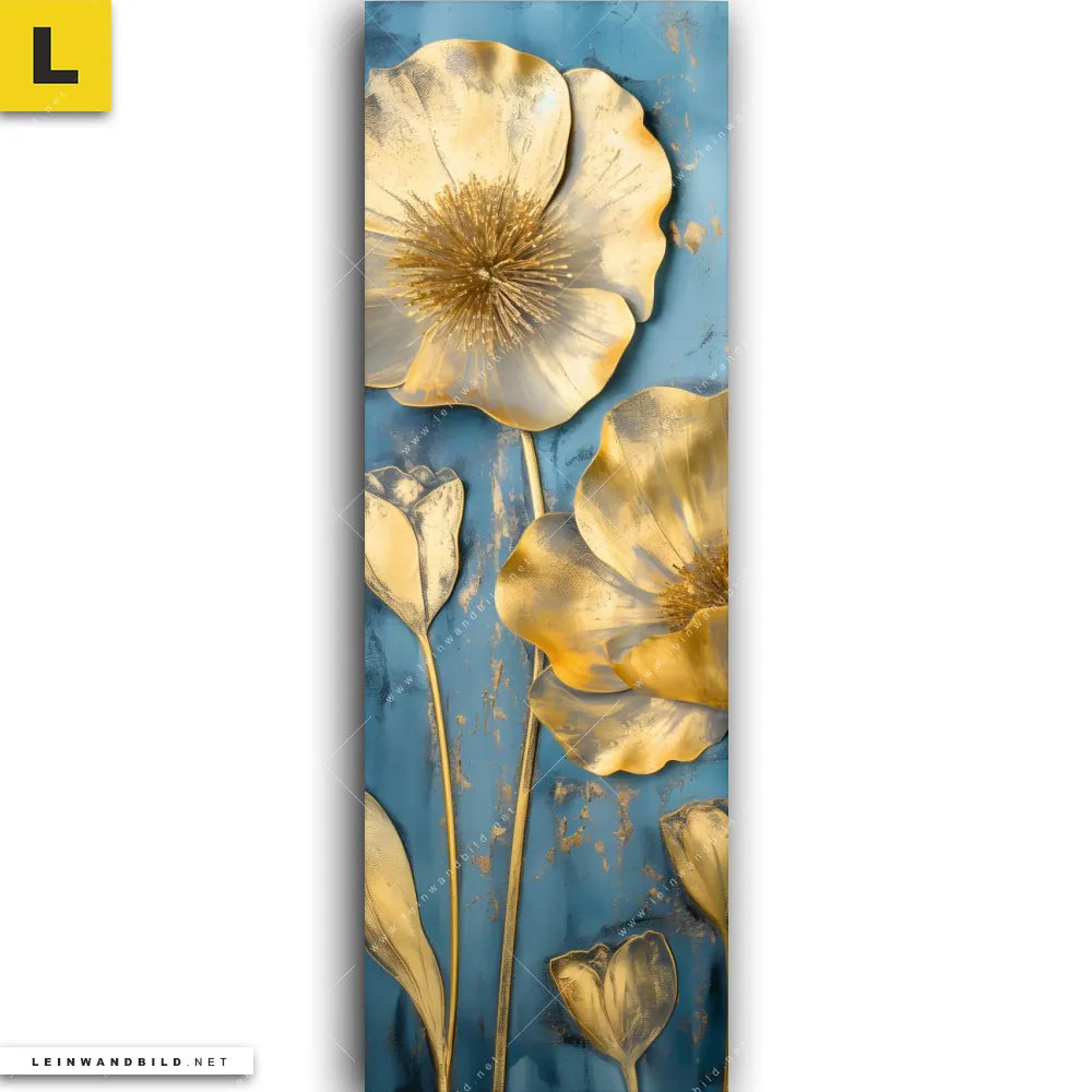 Du konfigurierst Dein individuelles Leinwandbild | Goldene Blumen auf Blau | Schmal und wir produzieren es NEU für Dich. Unsere Blumen - Botanik Leinwände sind KEINE Lagerware. Du bist Dir unsicher, welches Motiv oder Format das richtige für dein individuelles Keilrahmenbild ist, dann helfen wir dir gerne weiter und beraten dich!