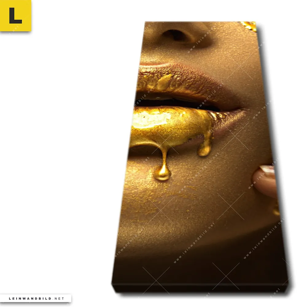 Du konfigurierst Dein individuelles Leinwandbild | Goldene Lippen | Schmal und wir produzieren es NEU für Dich. Unsere Porträts - Menschen Leinwände sind KEINE Lagerware. Du bist Dir unsicher, welches Motiv oder Format das richtige für dein individuelles Keilrahmenbild ist, dann helfen wir dir gerne weiter und beraten dich!