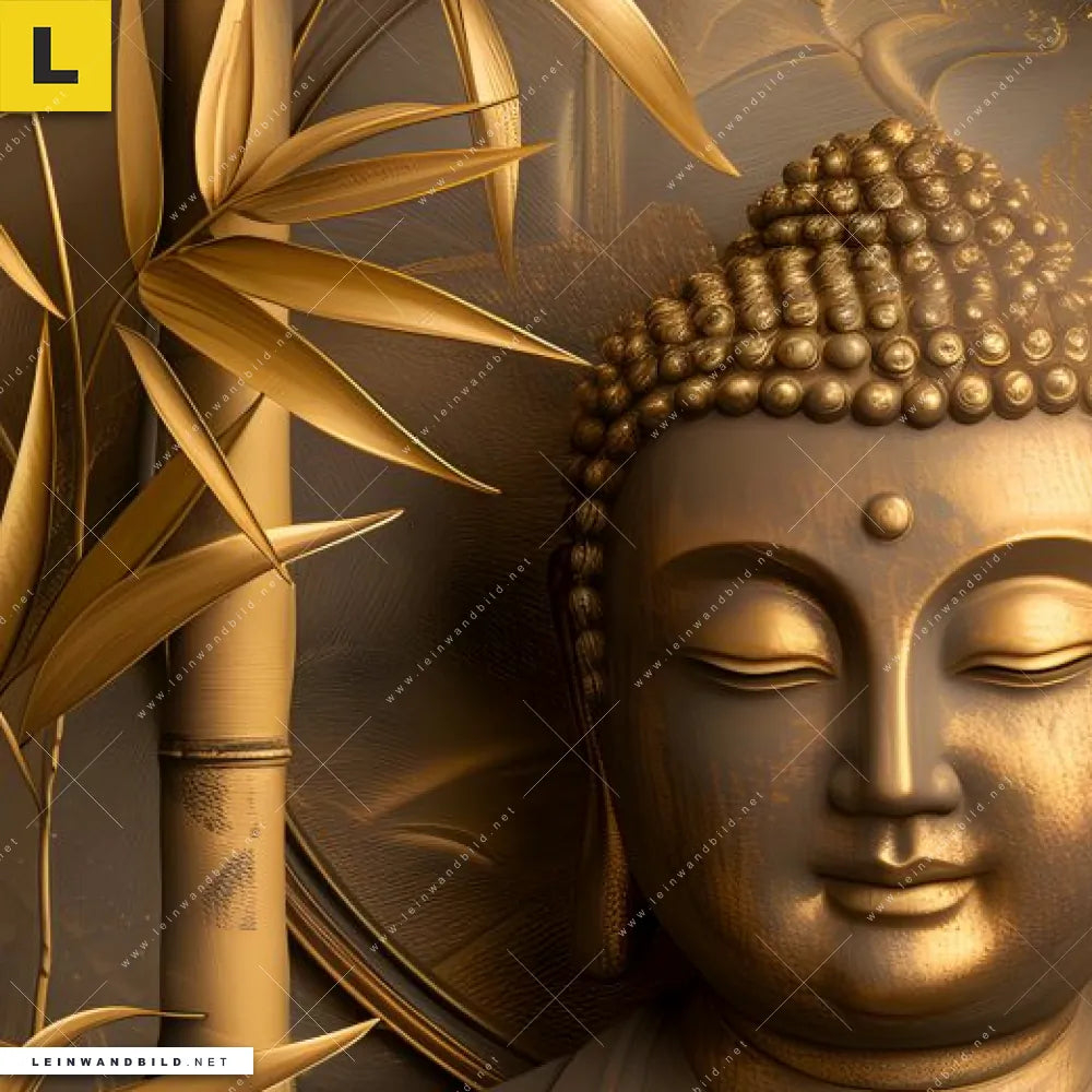 Das Leinwandbild | Goldener Buddha im Bambuswald | Schmal wird auf 260 g/m² Polyester-Stretch-Canvas gedruckt und überzeugt in den Farben Gold, Braun, Beige mit hoher Farbintensität, Farbsättigung und langer Farb-Echtheit. Bei der Herstellung unserer Buddha - Feng Shui Leinwandbilder im Schmal achten wir stets auf hochwertige Qualität, sowohl im Verarbeitungsprozess als auch bei den Materialien. Die Leinwand mit dem Motiv Buddha-Statue im goldenen Glanz im Schmal wird fix und fertig, auf einem 2cm starken Holzkeilrahmen aufgespannt, geliefert. Vom Druck über den Rahmenbau bis zum Bespannen des Leinwandbildes Friedlicher Buddha im Bambuswald mit Bambus, Buddha, Statue, Asien, Buddhismus, Religion, Feng Shui, Zen, Meditation gestaltet als Digitale Kunst wird bei uns alles in verantwortungsvoller Handarbeit gefertigt.