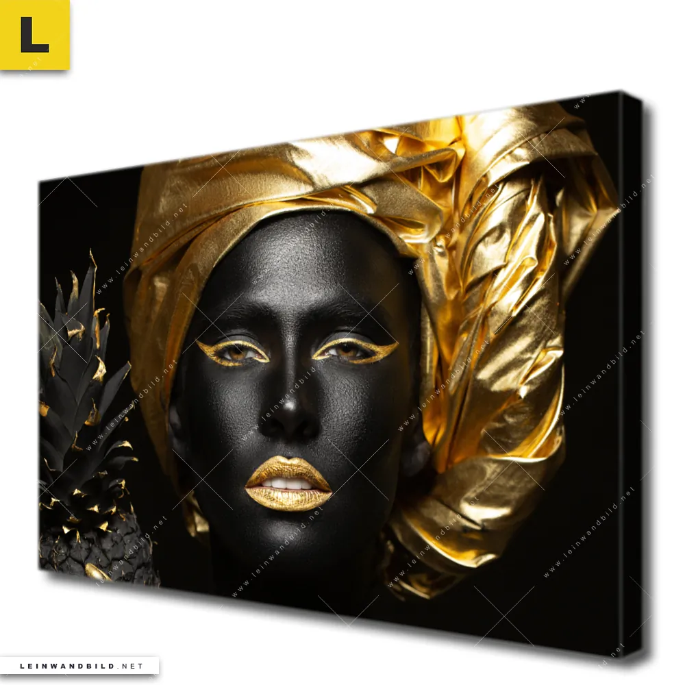 Dann sollte das Leinwandbild | Goldenes Ananasmädchen No.1 | Querformat den Weg zu Dir finden. Die moderne Fotoleinwand Frau mit goldener Kopfbedeckung fügt sich als Eye-Catcher harmonisch in jedes Bar - Gastronomie, Friseur - Beauty, Wohnzimmer - Schlafzimmer Raumkonzept ein.