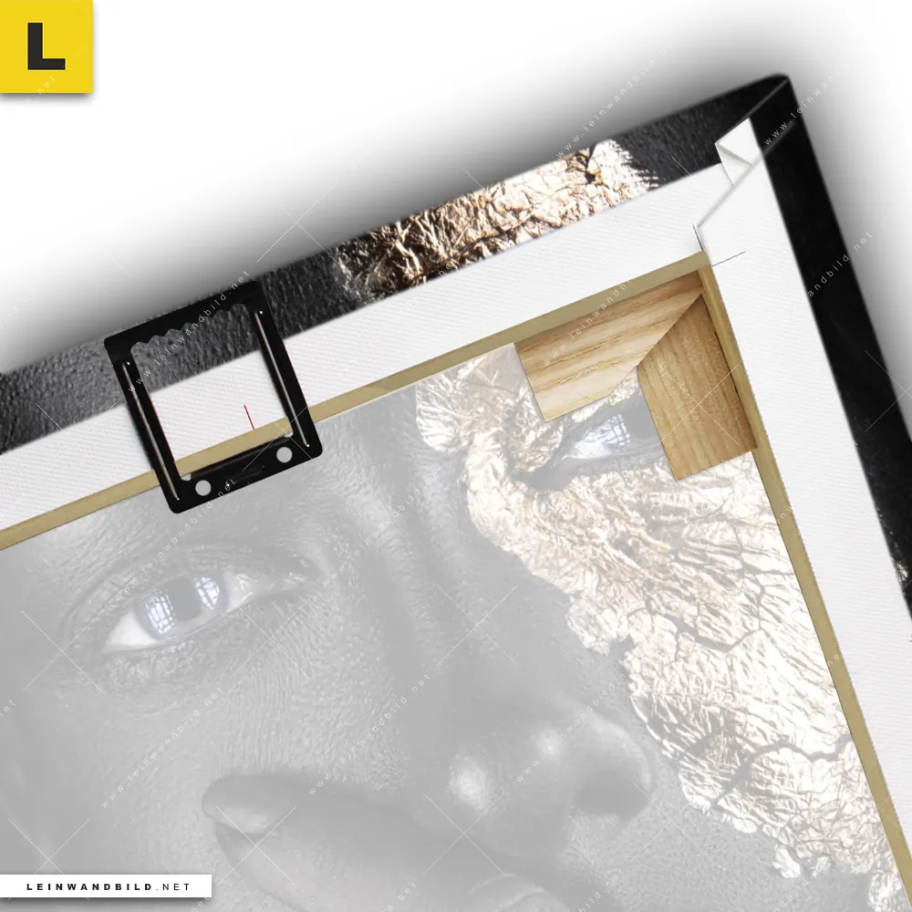 Das Leinwandbild | Goldenes Make-up | Quadrat wird auf 260 g/m² Polyester-Stretch-Canvas gedruckt und überzeugt in den Farben Gold, Schwarz mit hoher Farbintensität, Farbsättigung und langer Farb-Echtheit. Bei der Herstellung unserer Porträts - Menschen Leinwandbilder im Quadrat achten wir stets auf hochwertige Qualität, sowohl im Verarbeitungsprozess als auch bei den Materialien. Die Leinwand mit dem Motiv Porträt mit Blattgold im Quadrat wird fix und fertig, auf einem 2cm starken Holzkeilrahmen aufgespannt, geliefert. Vom Druck über den Rahmenbau bis zum Bespannen des Leinwandbildes Frauenporträt mit Metalleffekten mit Frau, Porträt, Erotik, modern, Gold, Farbe, Beauty, Gesicht, Körper, Make-up gestaltet als Fotografie wird bei uns alles in verantwortungsvoller Handarbeit gefertigt.