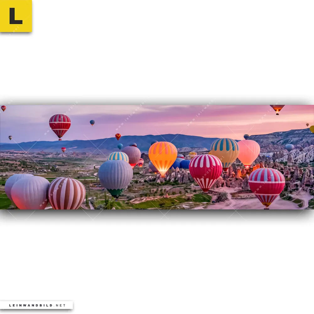Du konfigurierst Dein individuelles Leinwandbild | Heißluftballons im Sonnenuntergang | Panorama und wir produzieren es NEU für Dich. Unsere Landschaften Leinwände sind KEINE Lagerware. Du bist Dir unsicher, welches Motiv oder Format das richtige für dein individuelles Keilrahmenbild ist, dann helfen wir dir gerne weiter und beraten dich!